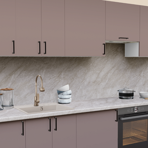 4. Прямая кухня Пастель какао 1218 со столешницей 9585-S Мрамор бежевый светлый и со стеновой панелью 9585-S Мрамор бежевый светлый.