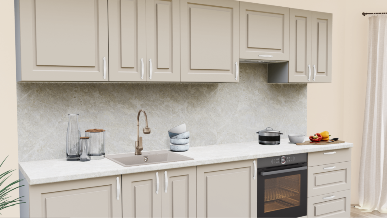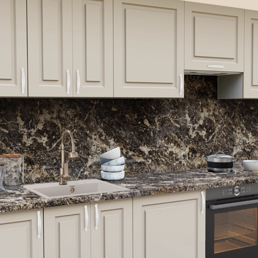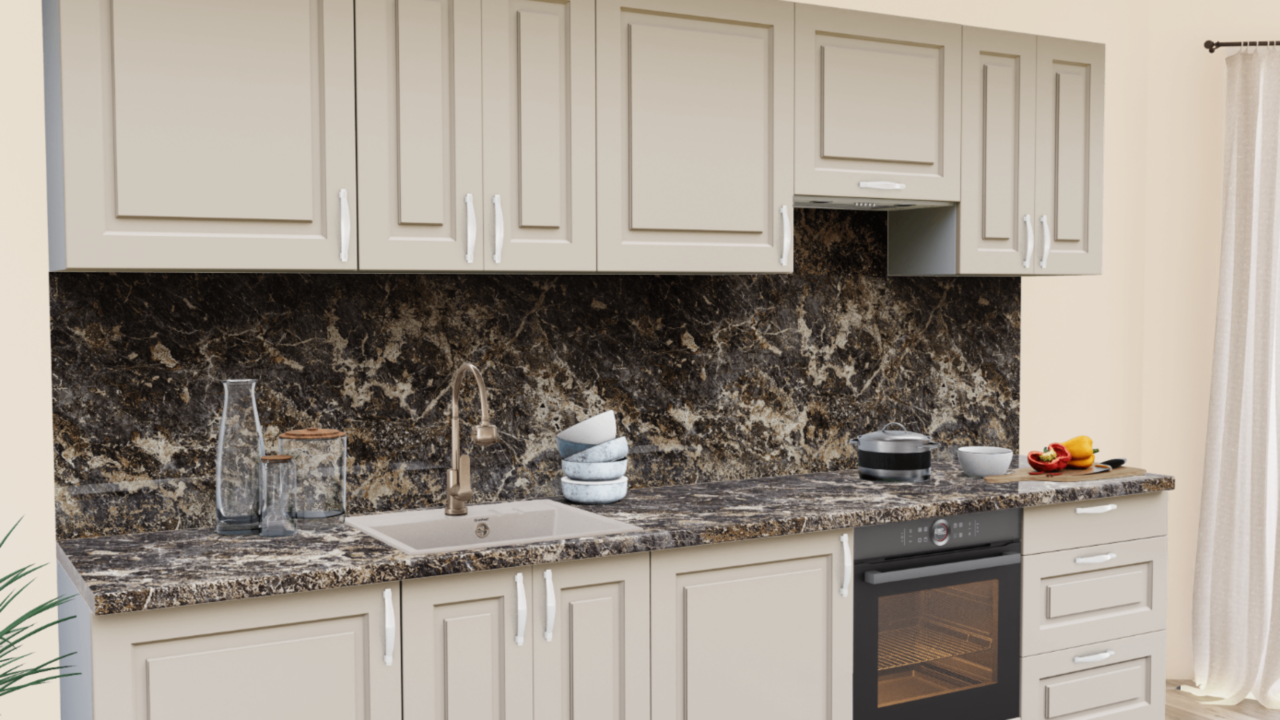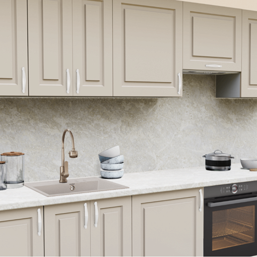 1. Прямая кухня Пастель Латте 1220 Прямоугольник со столешницей 7024-Е Мрамор Империал и со стеновой панелью 7024-Е Мрамор Империал.