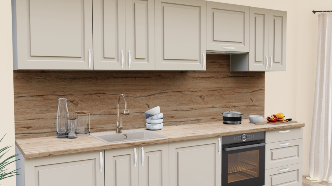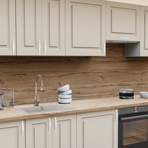 4. Прямая кухня Пастель Латте 1220 Прямоугольник со столешницей 2075 FL Дуб кера и со стеновой панелью 2075 FL Дуб кера.