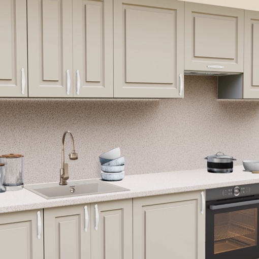 3. Прямая кухня Пастель Латте 1220 Прямоугольник со столешницей 2848-S Гренобль и со стеновой панелью 2848-S Гренобль.
