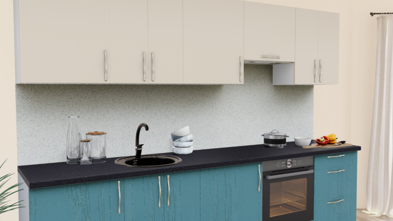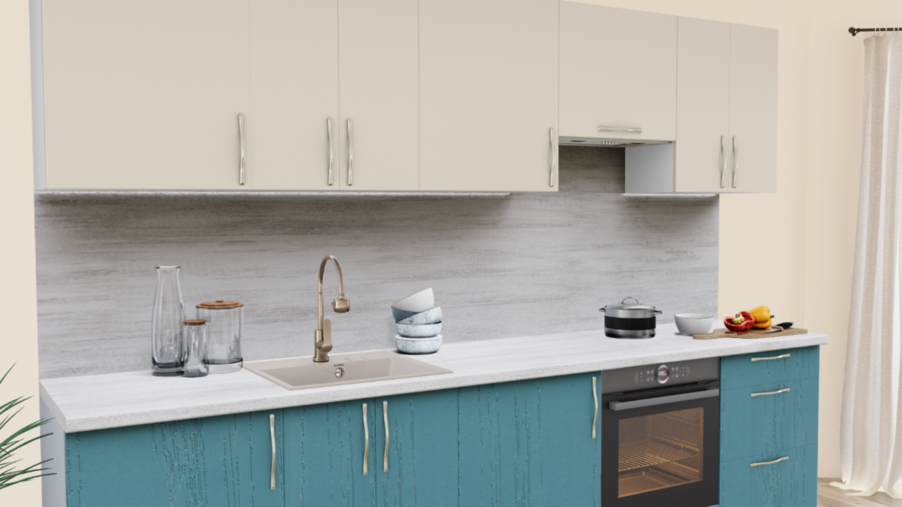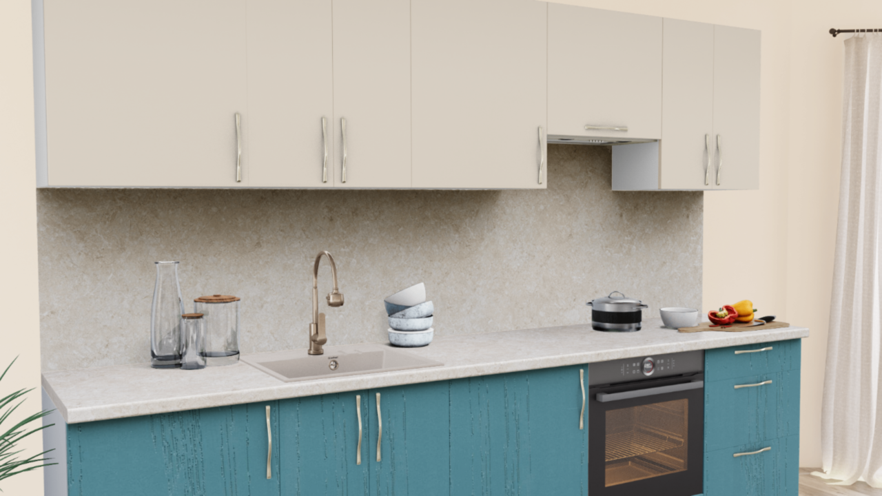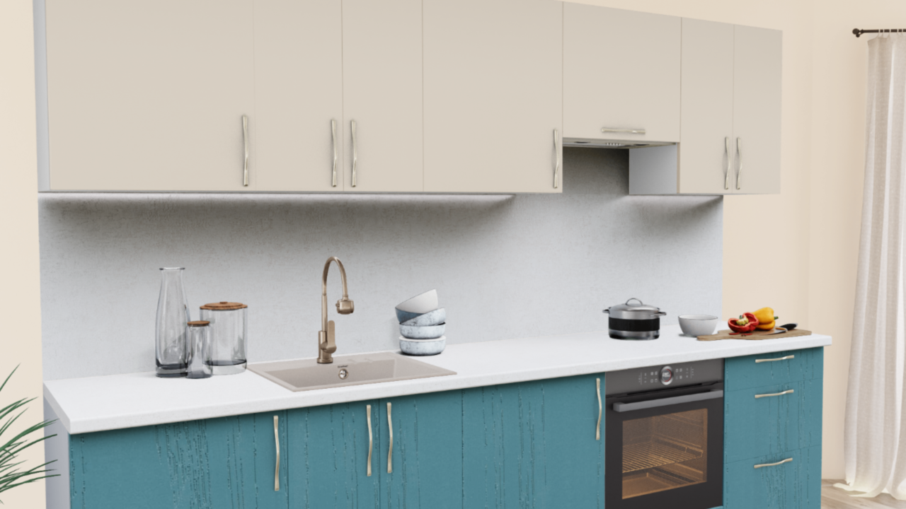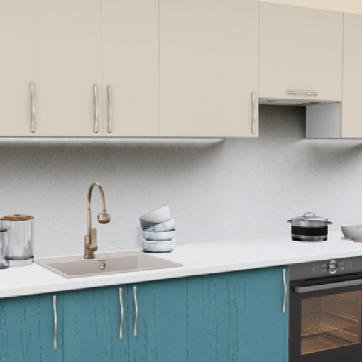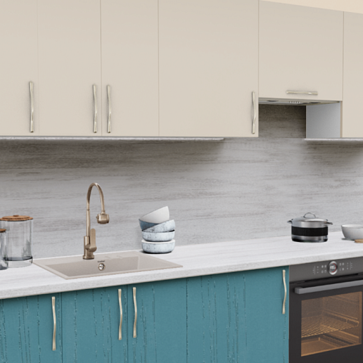 Кухонный гарнитур в минималистичном стиле. Бежевая цветовая гамма верхних фасадов гармонично дополняется теплой цветовой гаммой столешницы и мягкими линиями ручек, а цвет аквамарина на нижних фасадах привносит ощущение легкости и свежести.
