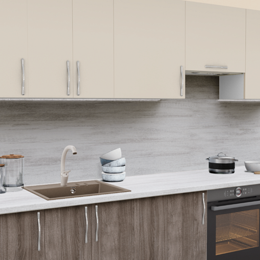 2. Прямая кухня Пастель мокко 1221 со столешницей 757-1 Терезина и со стеновой панелью 757-1 Терезина.