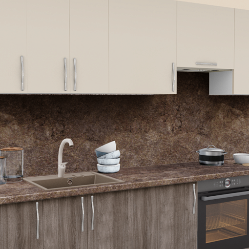 4. Прямая кухня Пастель мокко 1221 со столешницей 910-Br Обсидиан коричневый и со стеновой панелью 910-Br Обсидиан коричневый.