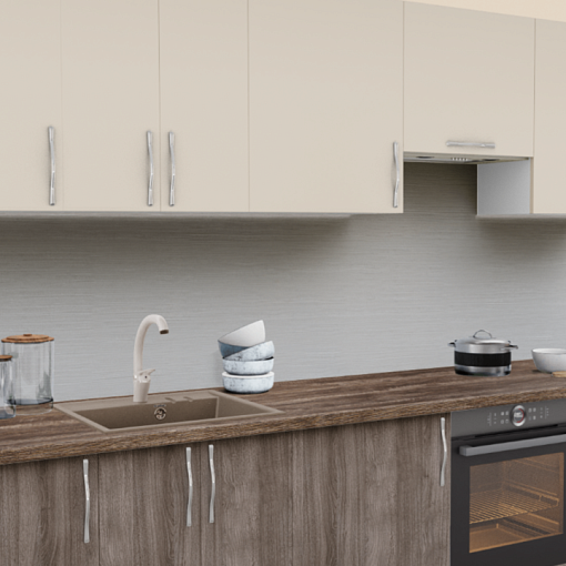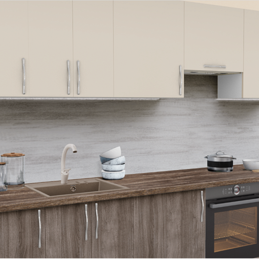 5. Прямая кухня Пастель мокко 1221 со столешницей 2072-Р Дуб Мокко и со стеновой панелью 7046-S Daily.