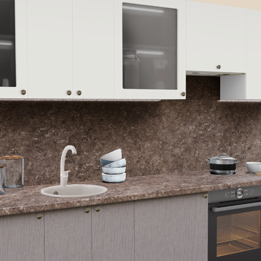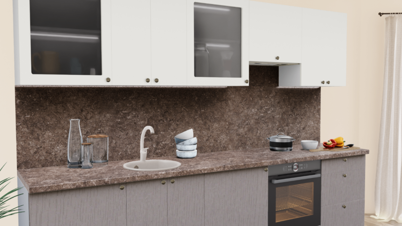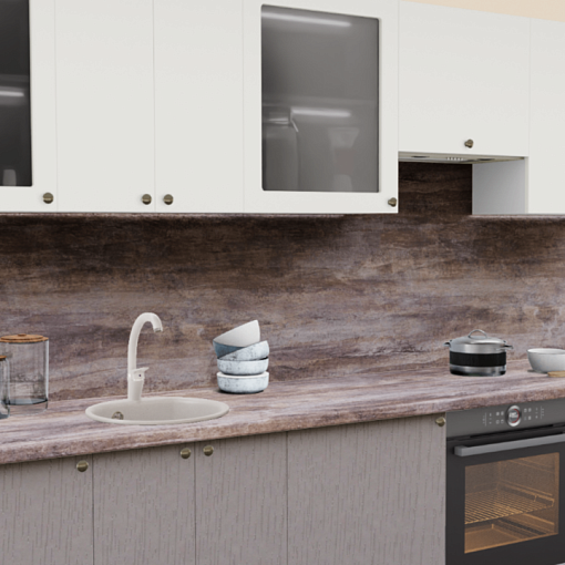 3. Прямая кухня Пастель сливки 1223 со столешницей 4035-S Аламбра темная и со стеновой панелью 4035-S Аламбра темная.