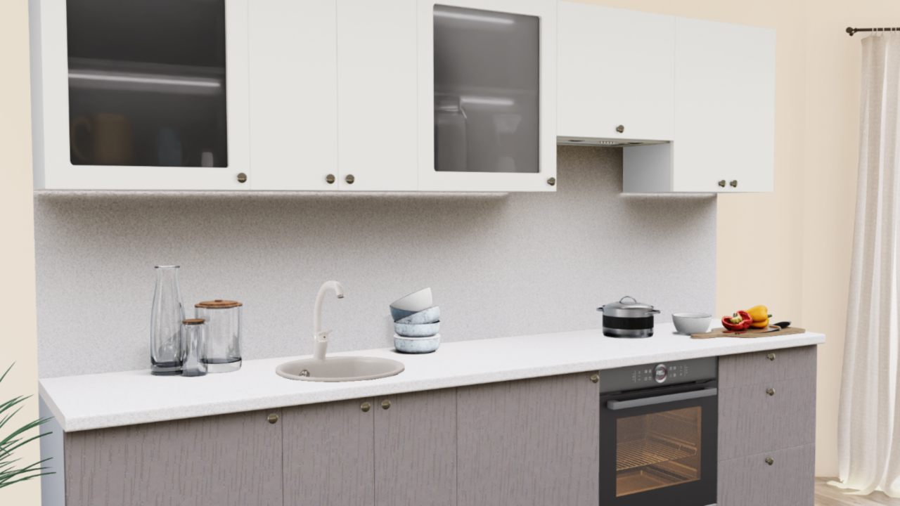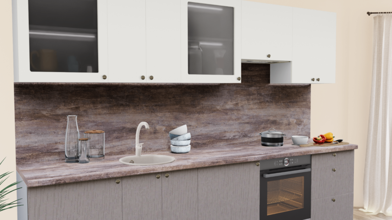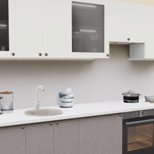 1. Прямая кухня Пастель сливки 1223 со столешницей 2235-S Семолина серая и со стеновой панелью 2235-S Семолина серая.