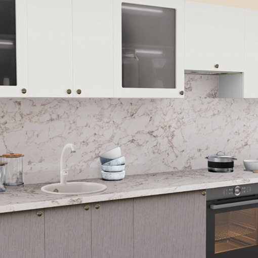 4. Прямая кухня Пастель сливки 1223 со столешницей 920-1 Мрамор миланский и со стеновой панелью 920-1 Мрамор миланский.