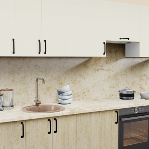 5. Прямая кухня Пастель ваниль 1224 со столешницей 3829-NW Дуб Бунрати и со стеновой панелью 3829-NW Дуб Бунрати.