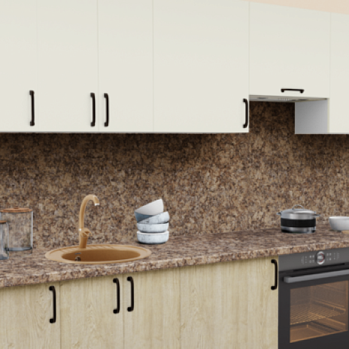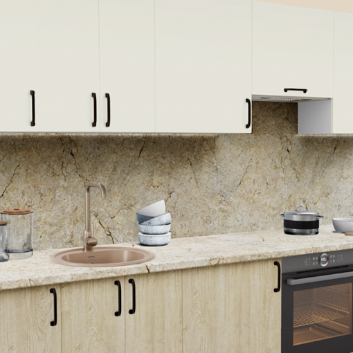 1. Прямая кухня Пастель ваниль 1224 со столешницей 7493/S Умбрия и со стеновой панелью 7493/S Умбрия.