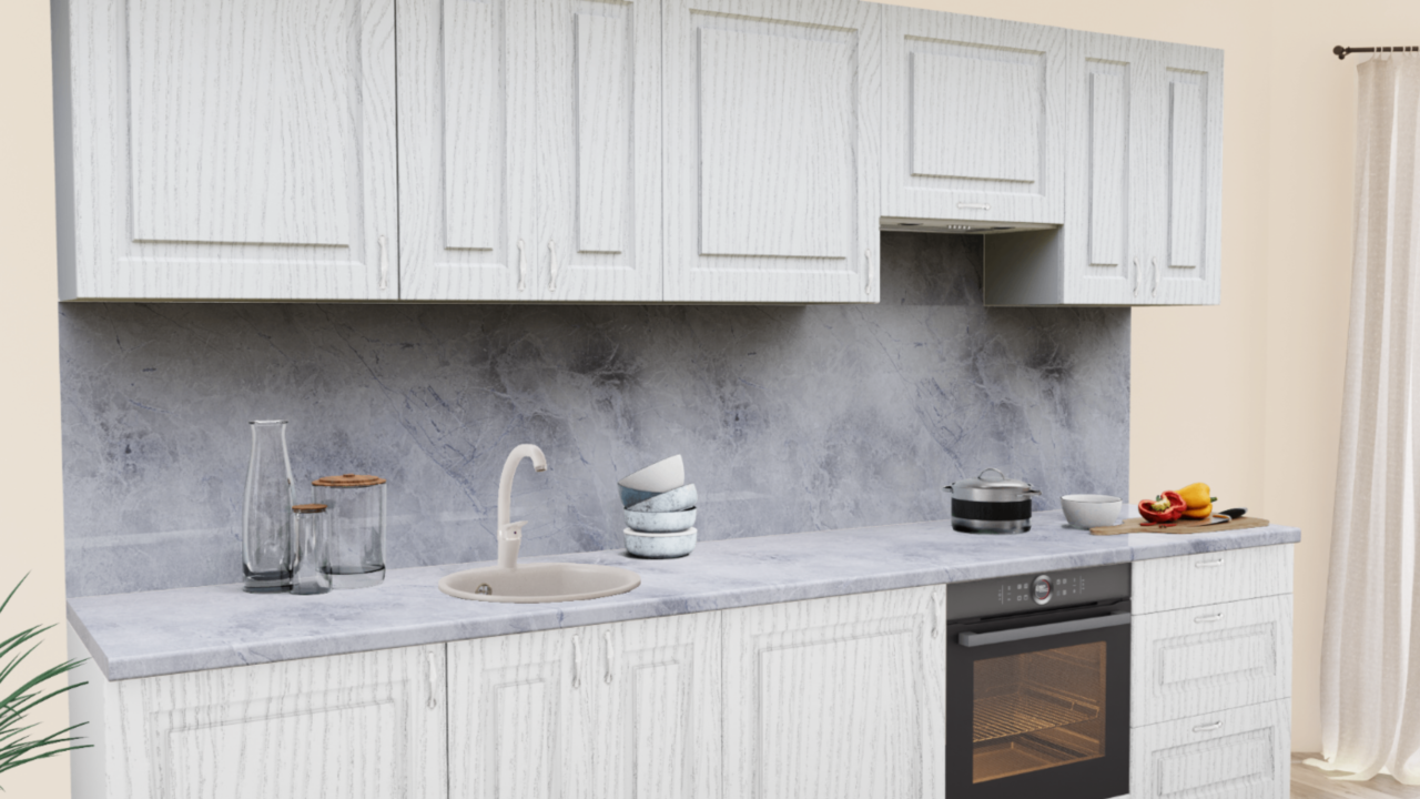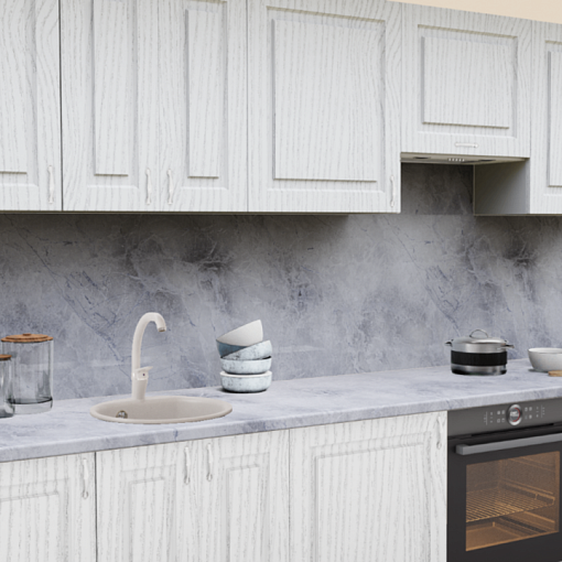 2. Прямая кухня Патина Ясень серебристый 7554 Прямоугольник со столешницей 2349-Pt Мрамор Бернини и со стеновой панелью 2349-Pt Мрамор Бернини.