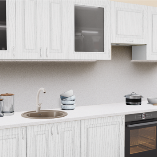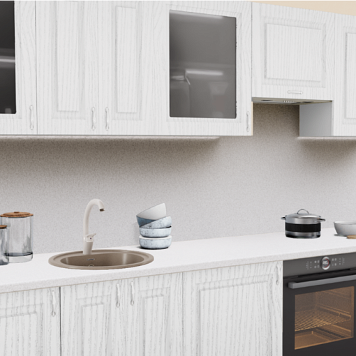 Белый кухонный гарнитур - лидер среди расцветок для кухни. Он создает объемность пространства, ощущение чистоты, свободы и обилия воздуха. Эффектность этому варианту придает сочетание строгой фрезеровки и патина под серебро. Актуальные текстуры под мрамор и камень на столешнице дополняются изящными ручками, создавая благородный и элегантный интерьер.