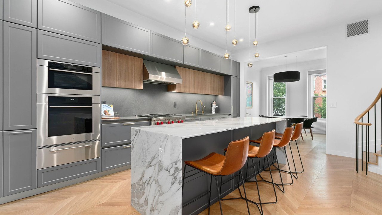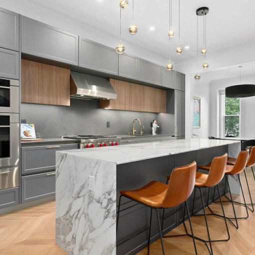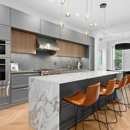 Современный кухонный гарнитур с антресольными шкафами. Сочетание серых фасадов с фрезеровкой и гладких верхних фасадов с яркой текстурой дерева. Интересным акцентом этого решения является барная стойка со столешницей под светлый мрамор, придающая интерьеру элегантность и благородство.