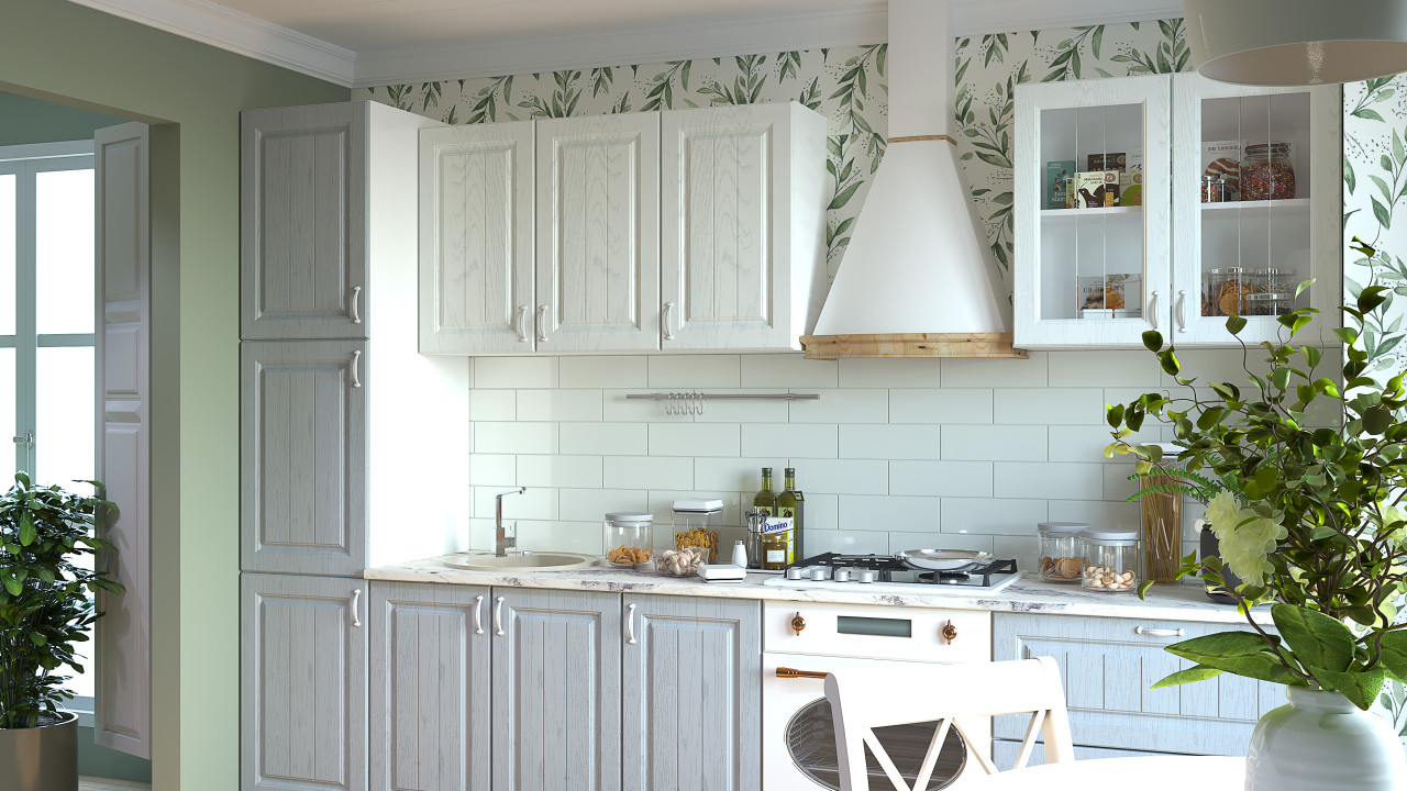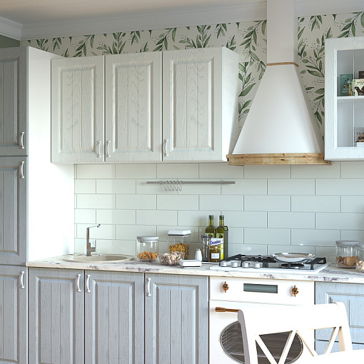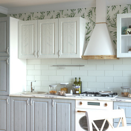 Кухонный гарнитур с классической фрезеровкой в сочетании с эффектом крашеного дерева на светлых фасадах. Светлый оттенок столешницы с рисунком под мрамор и светлые ручки придают этому решению воздушность и нежность.