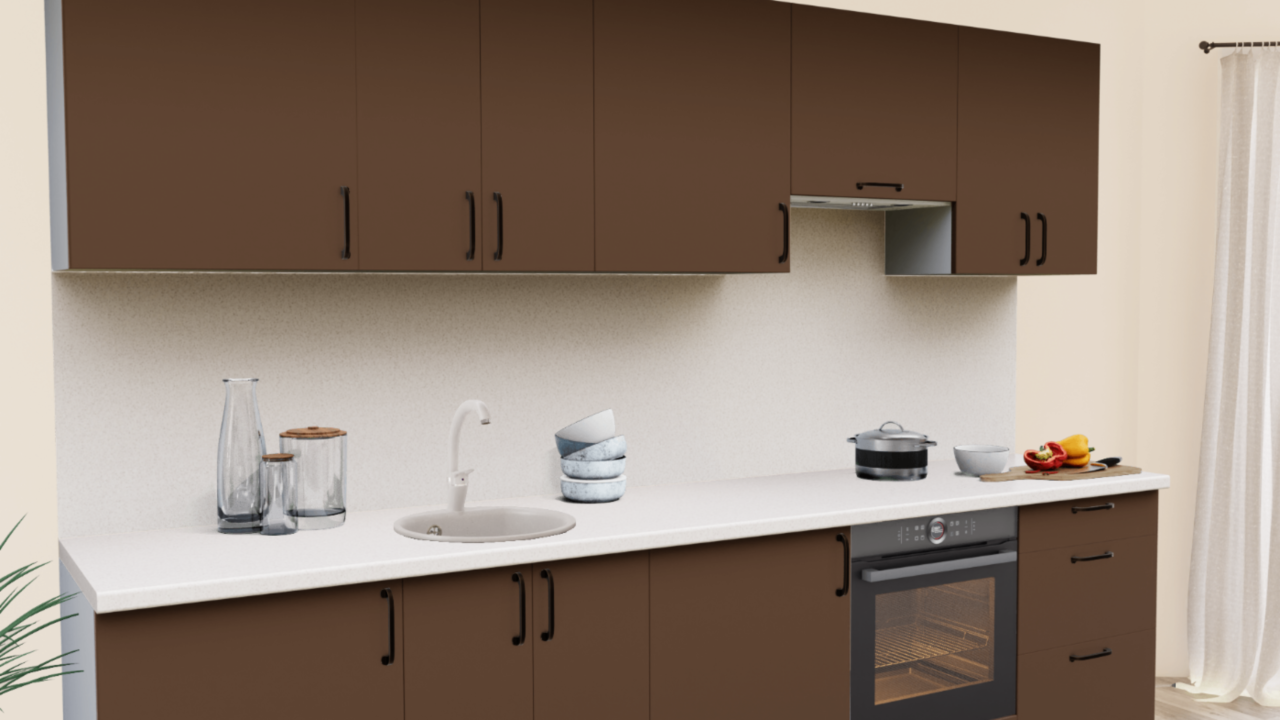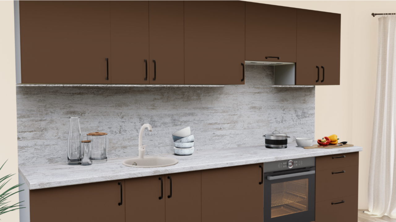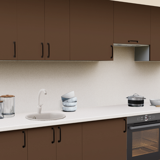 3. Прямая кухня Шоколад софт 7029-04 со столешницей 2236-S Семолина бежевая и со стеновой панелью 2236-S Семолина бежевая.