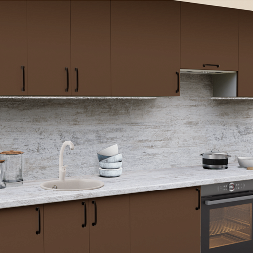 4. Прямая кухня Шоколад софт 7029-04 со столешницей 7050-М Винтажная сосна и со стеновой панелью 7050-М Винтажная сосна.