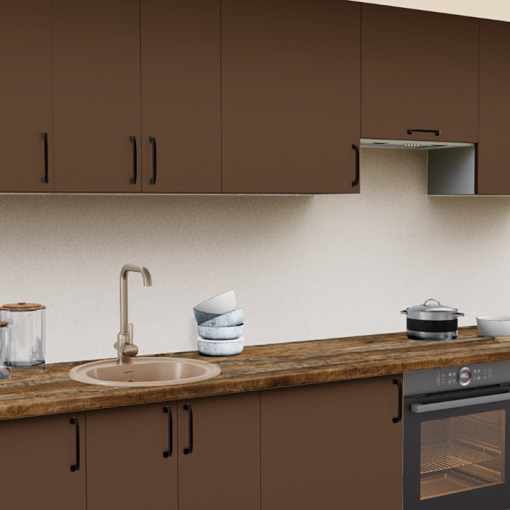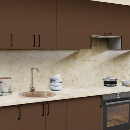 2. Прямая кухня Шоколад софт 7029-04 со столешницей 2062-S Трансильвания и со стеновой панелью 2236-S Семолина бежевая.