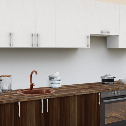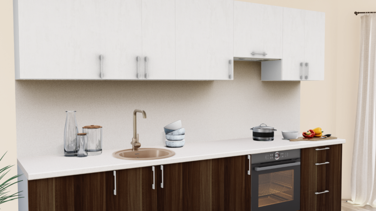 4. Прямая кухня Штукатурка кремовая 1863 со столешницей 2074-FL Дуб Каштан и со стеновой панелью 1110-S Белый.