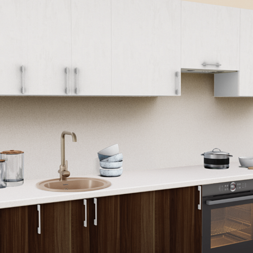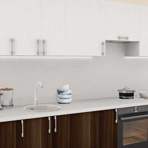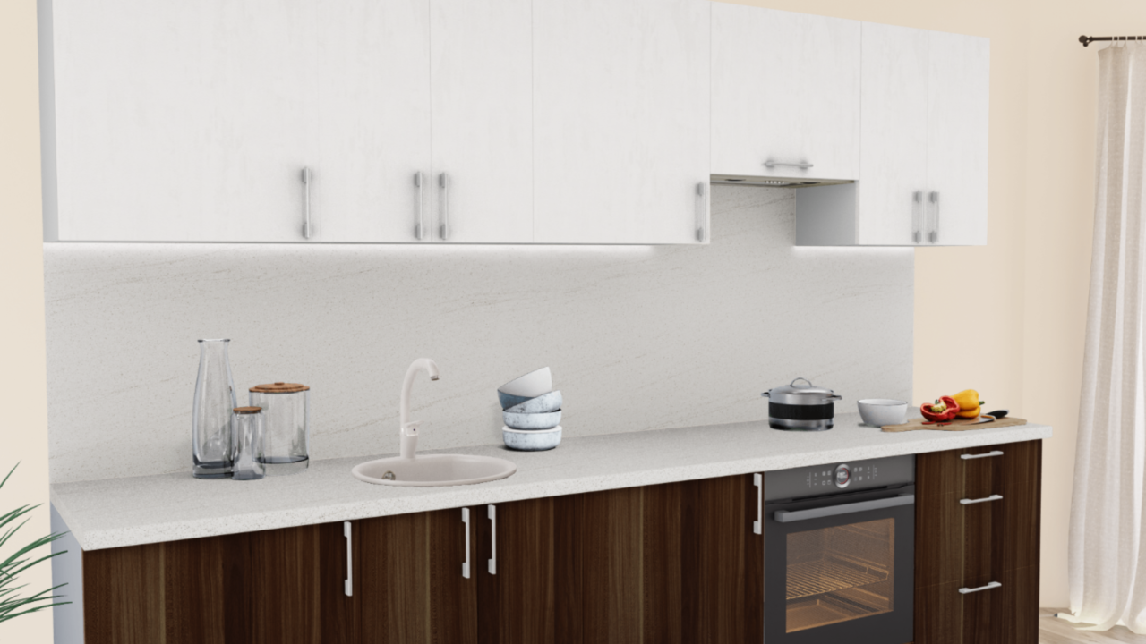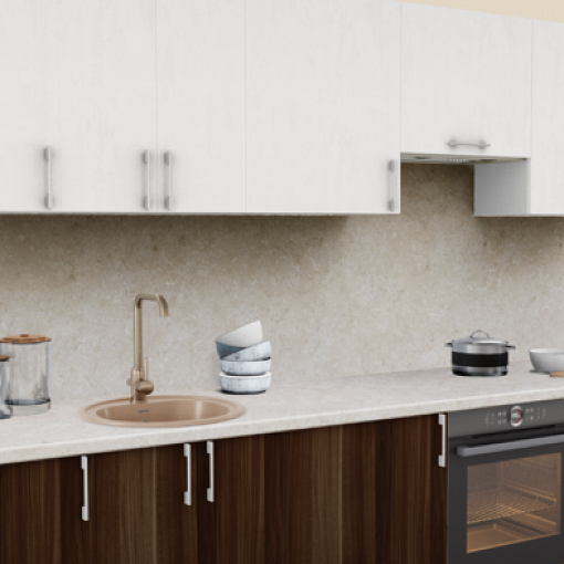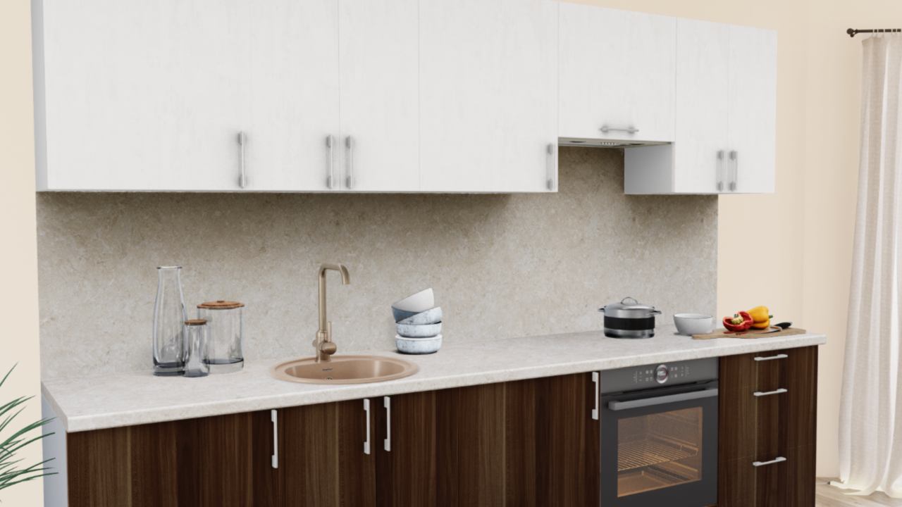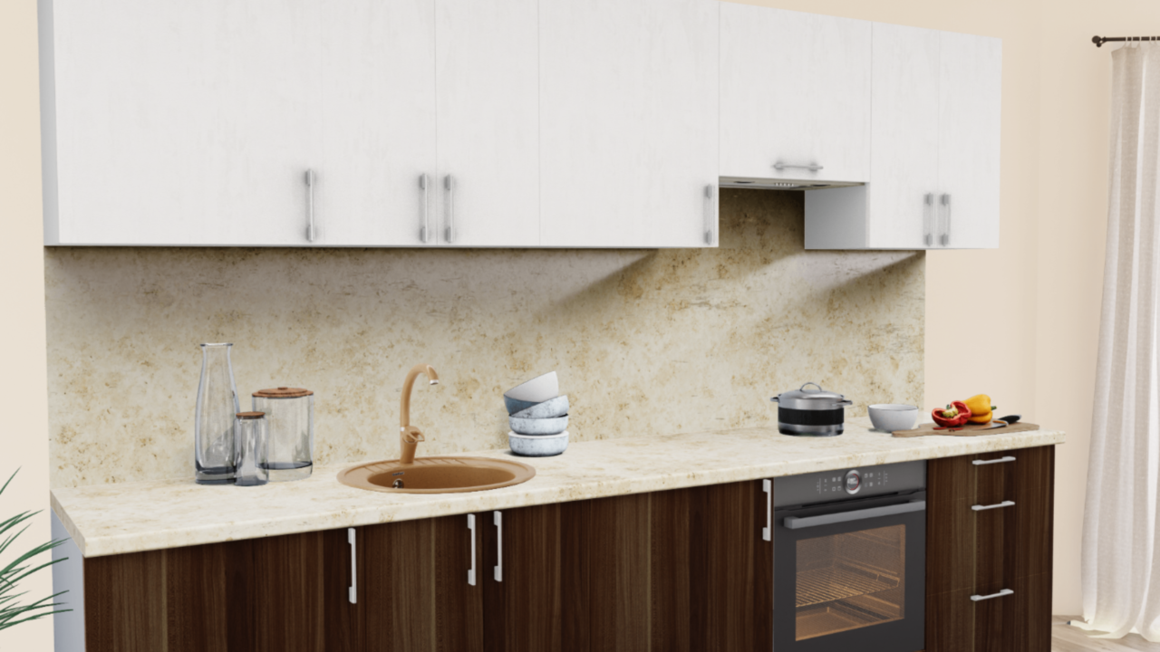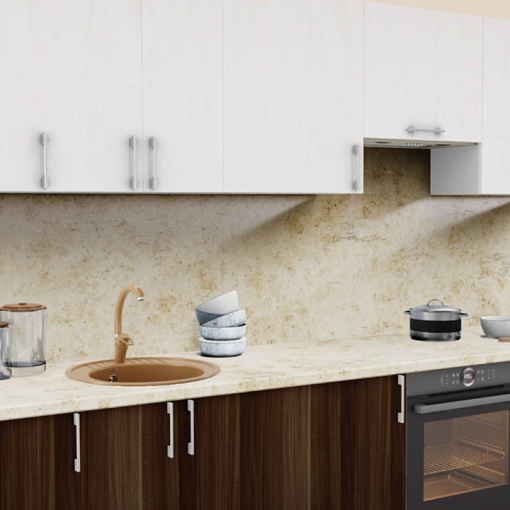 1. Прямая кухня Штукатурка кремовая 1863 со столешницей 4026-Q Аламбра и со стеновой панелью 4026-Q Аламбра.