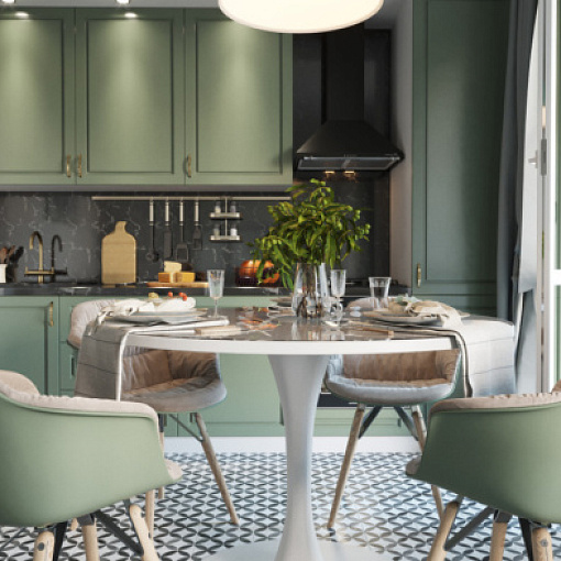 Кухонный гарнитур с элементами неоклассики. Благородный оттенок зеленого на фасаде подчеркивается легкой фрезеровкой и мягким оттенком бронзы на ручках. Темная столешница со светлыми вкраплениями добавляет глубины интерьеру, позволяя видоизменять общее впечатление в зависимости от элементов декора.