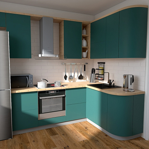 Кухонный гарнитур в ярких цветах на небольшой кухне - это возможно. Сочетание фасадов цвета аквамарин и теплой текстуры дерева делает этот вариант нестандартным и одновременно очень уютным.