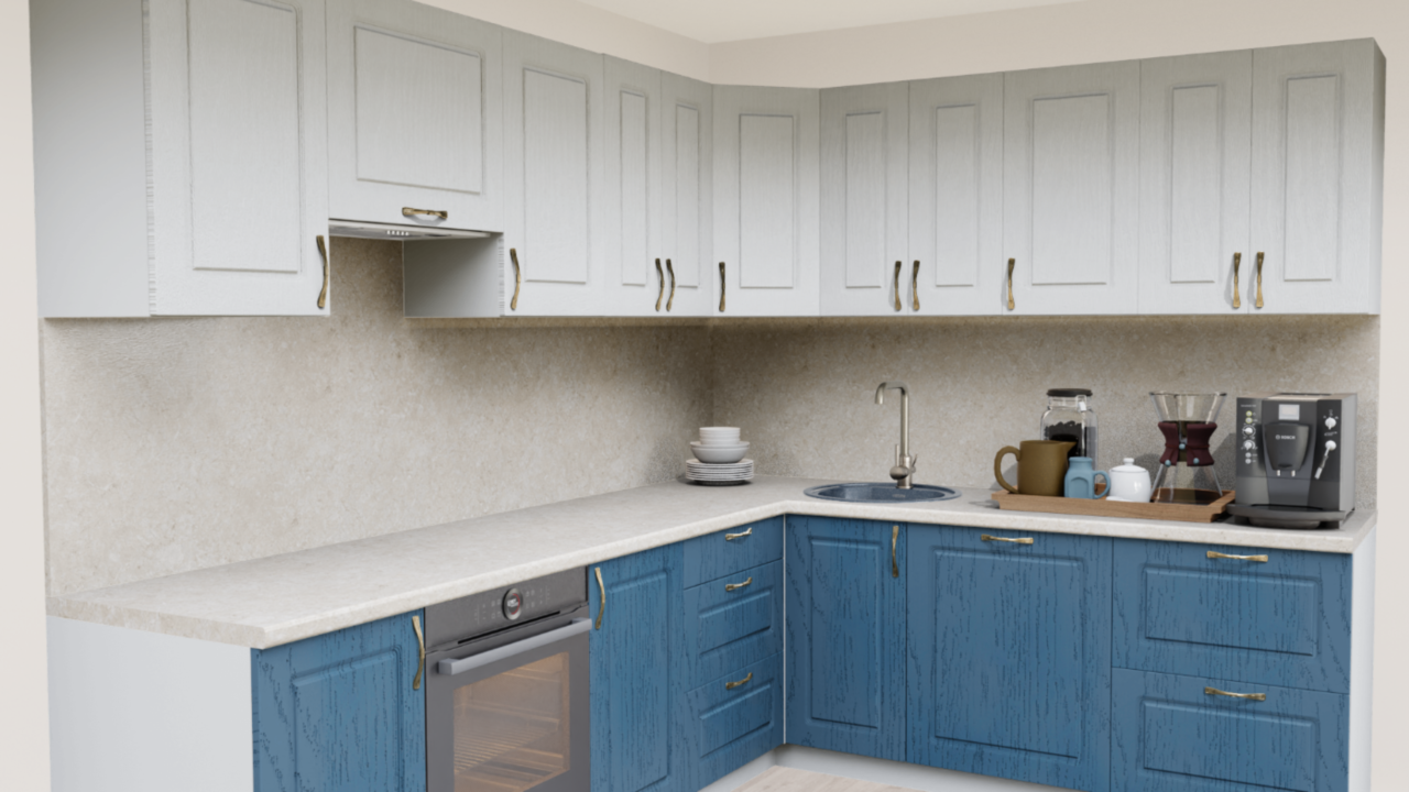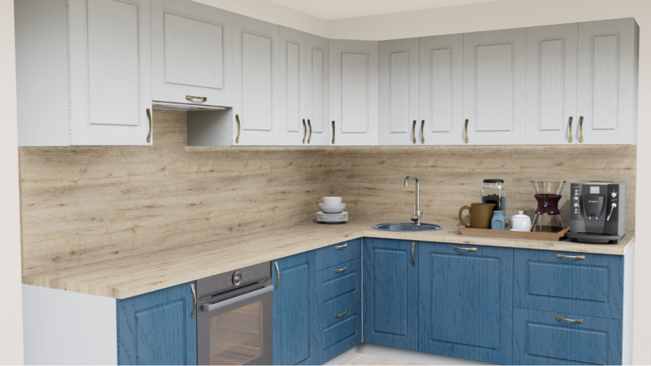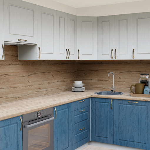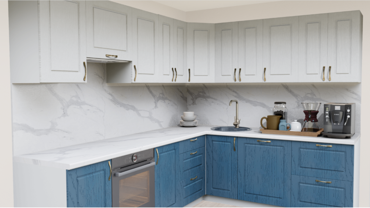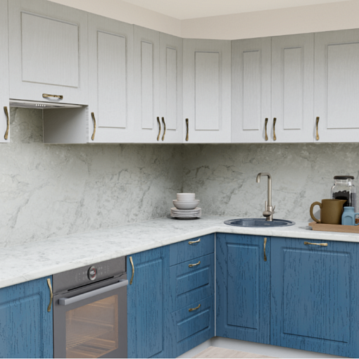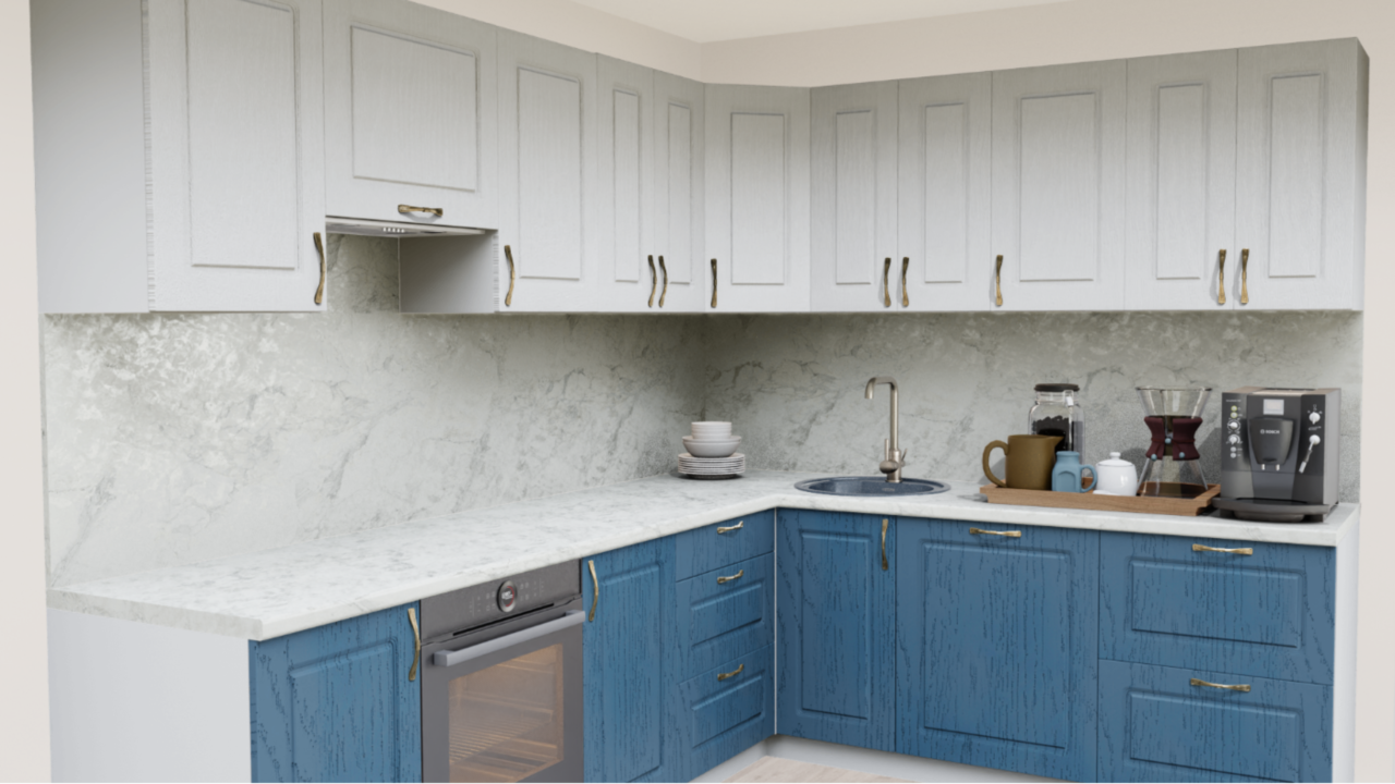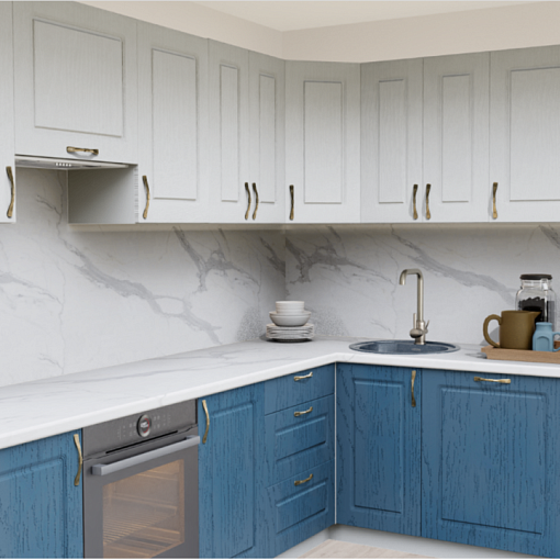 Классический кухонный гарнитур в сочетании белых и синих фасадов МДФ с фрезеровкой, дополнен бронзовыми ручками. Вариант отлично подойдет как для частного дома, так и для городской квартиры. Прямоугольная фрезеровка и свежие оттенки делают эту кухню ярким и, одновременно, уютным акцентом в интерьере.