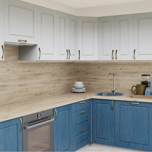4. Угловая кухня Белое дерево 3Т Квадро со столешницей 3852-Р Дуб Корсика и со стеновой панелью 3852-Р Дуб Корсика.
