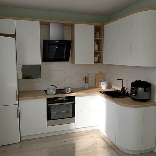 Кухонный гарнитур в скандинавском стиле. Белые матовые фасады в сочетании со светлой деревянной...подробнее