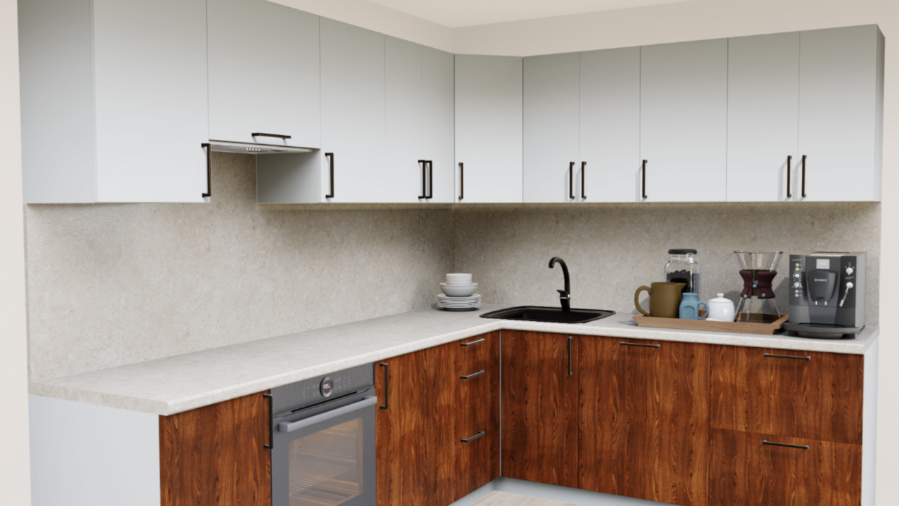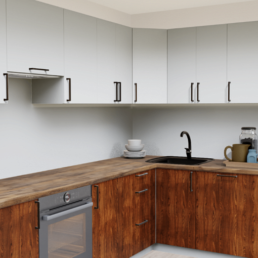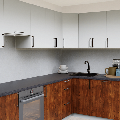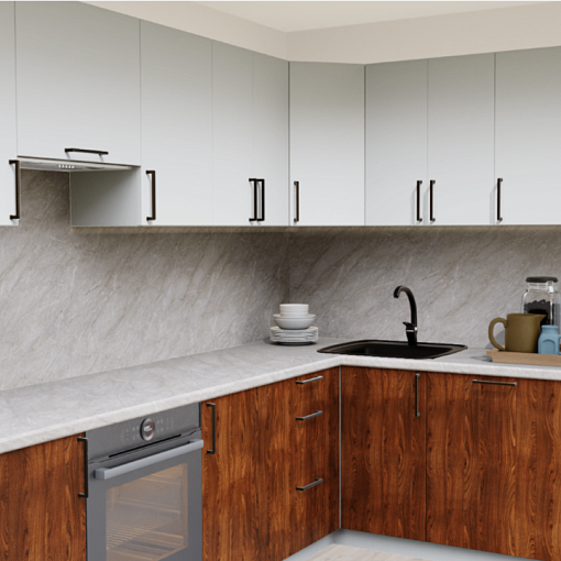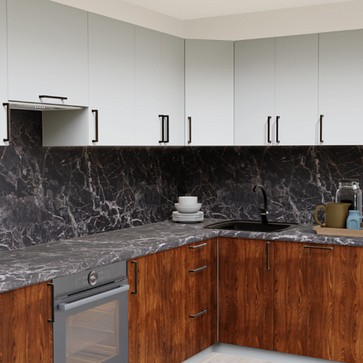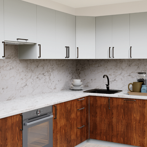 Современный кухонный гарнитур с фасадами МДФ с яркой текстурой ореха - актуальный тренд в дизайне кухонь. Стиль модерн в этом решении поддерживают белые матовые фасады и строгие ручки черного цвета. Столешницы, подобранные либо под верхние фасады, либо на контрасте, помогут правильно скорректировать восприятие кухни в любом размере помещения.