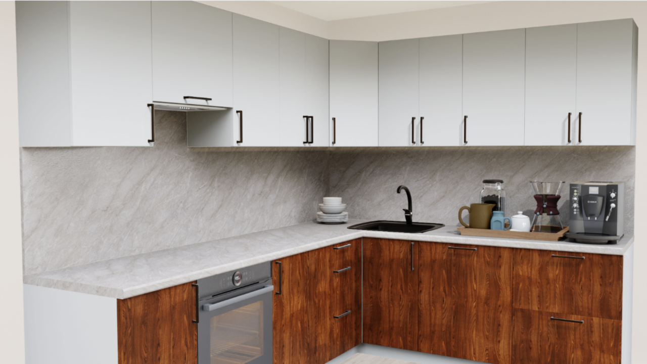 6. Угловая кухня Белый софт 3005 со столешницей 4026-Q Аламбра и со стеновой панелью 4026-Q Аламбра.