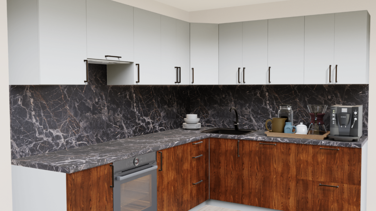 2. Угловая кухня Белый софт 3005 со столешницей 3029-S Мрамор марквина черный и со стеновой панелью 3029-S Мрамор марквина черный.