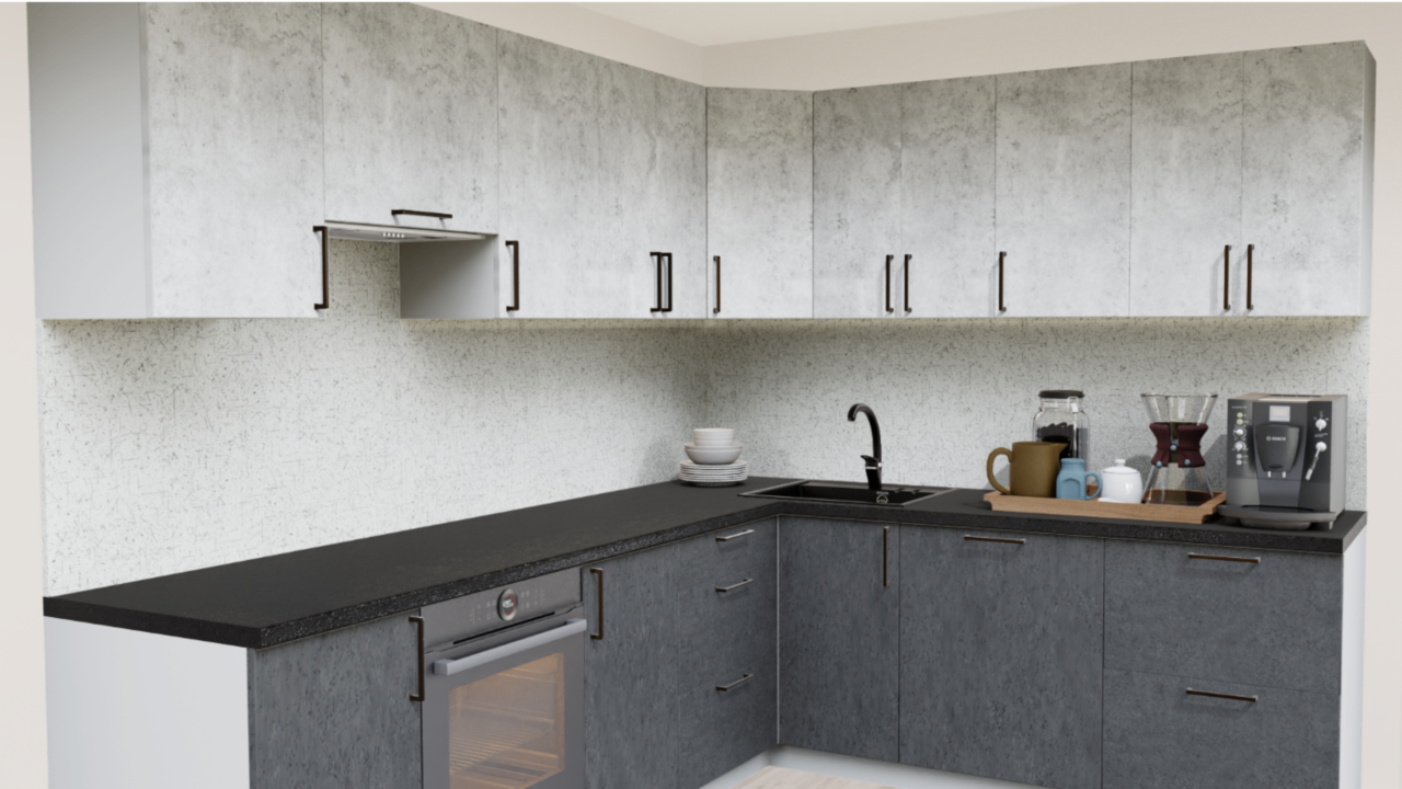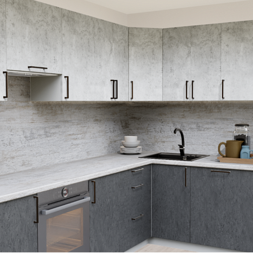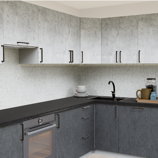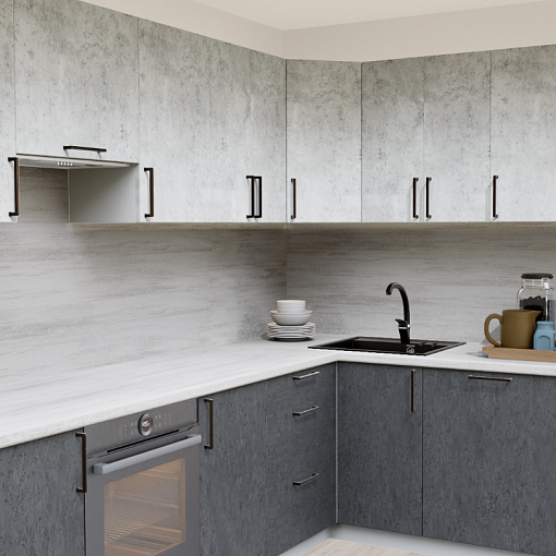 3. Угловая кухня Светлый бетон 1865 со столешницей 1021-Q Черный и со стеновой панелью 2919-S Ассиметрия.