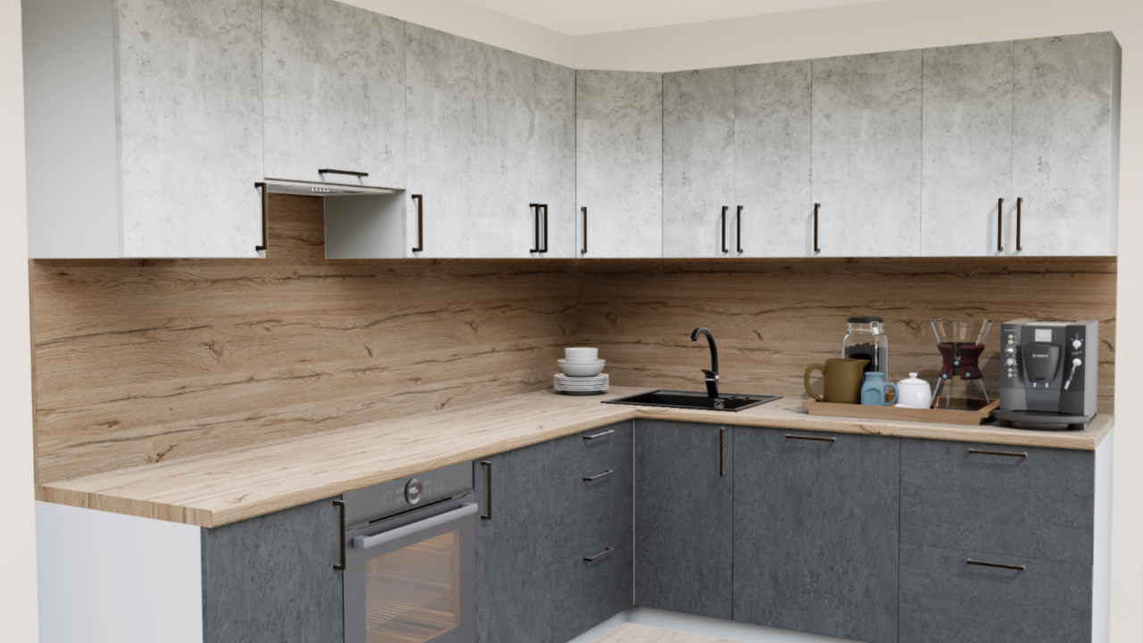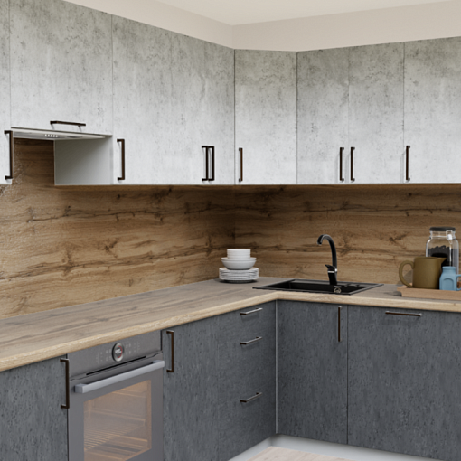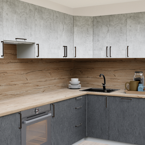 1. Угловая кухня Бетон светлый 1865 со столешницей 7052-FL Дуб Вотан и со стеновой панелью 7052-FL Дуб Вотан.