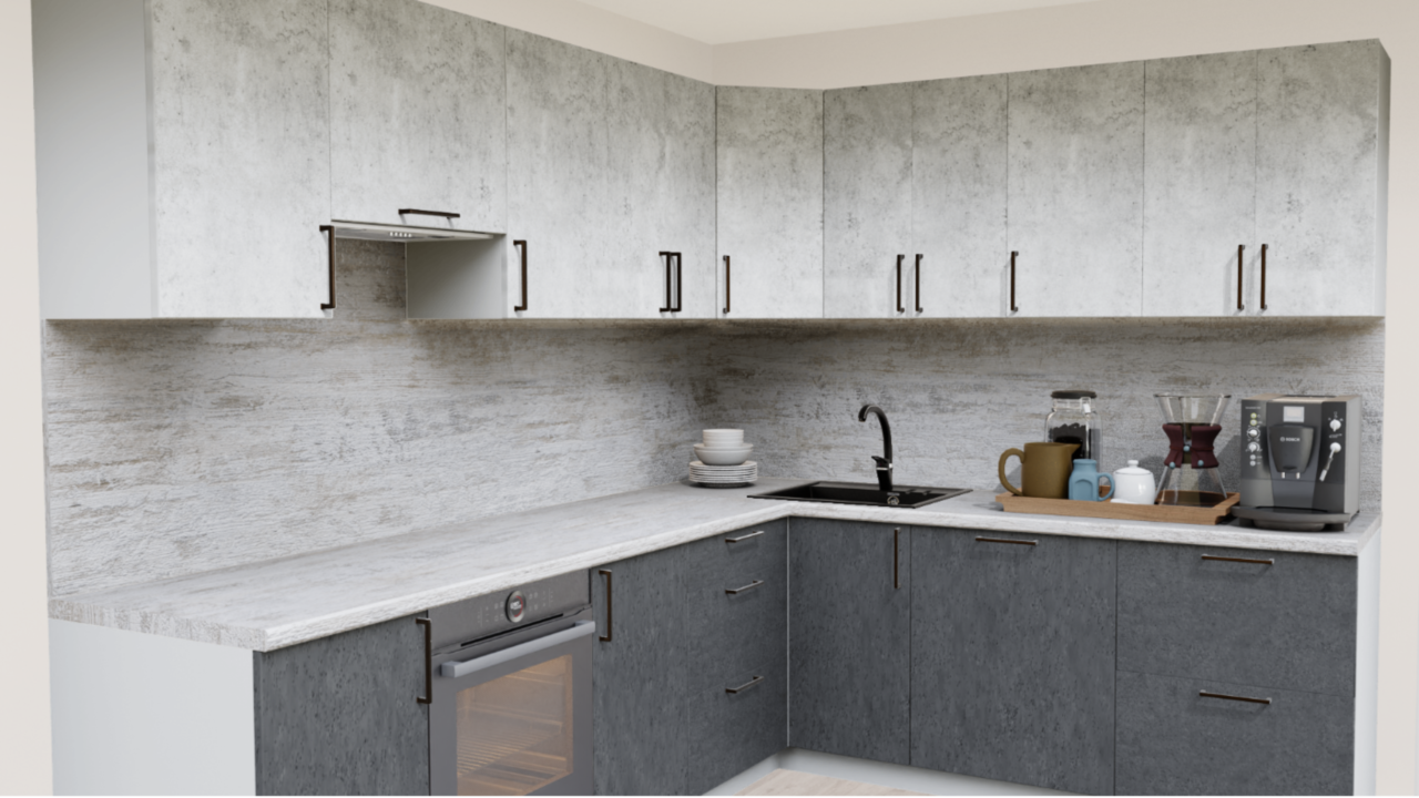 4. Угловая кухня Бетон светлый 1865 со столешницей 7046-S Daily и со стеновой панелью 7046-S Daily.
