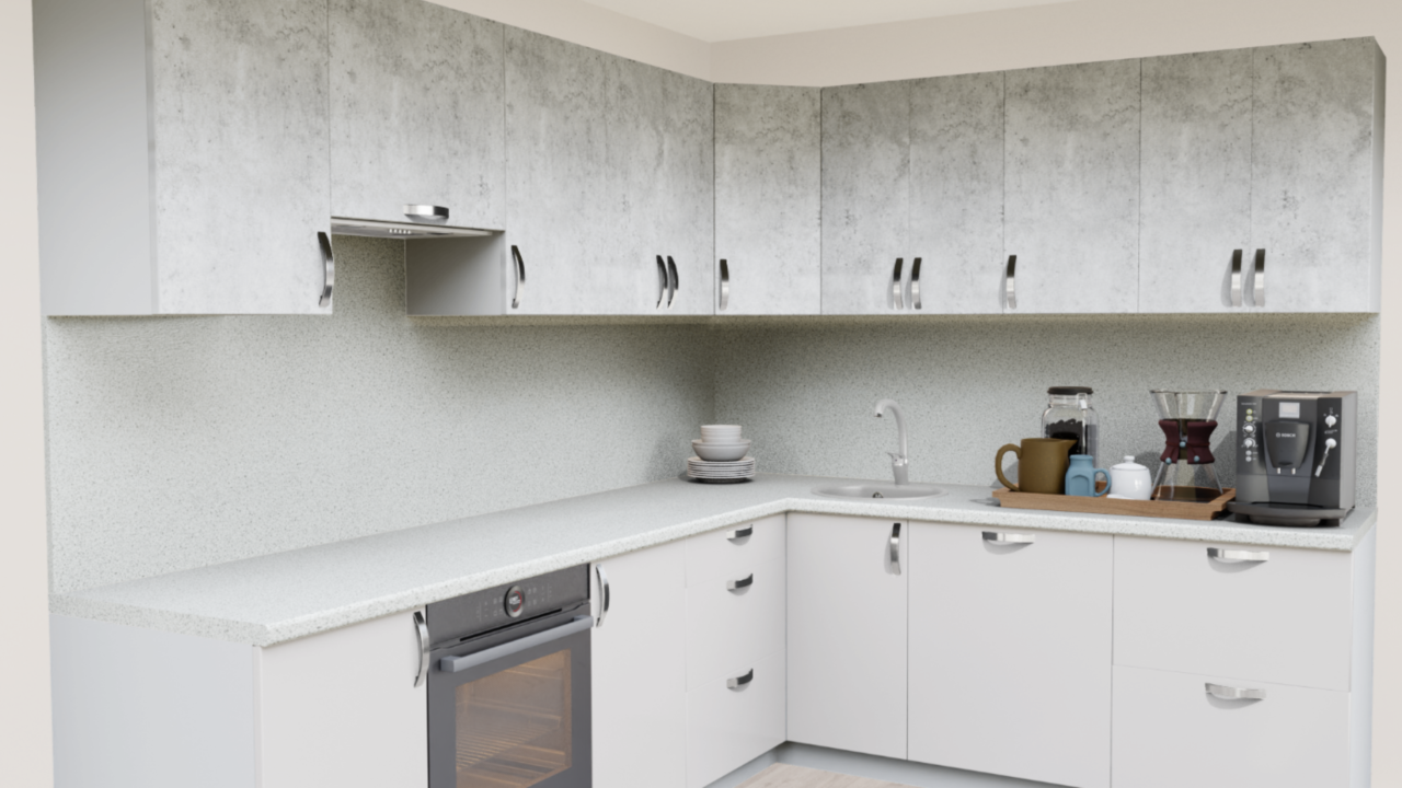 1. Угловая кухня Бетон светлый 1865 со столешницей 2946-R Галия и со стеновой панелью 2946-R Галия.