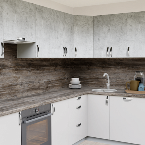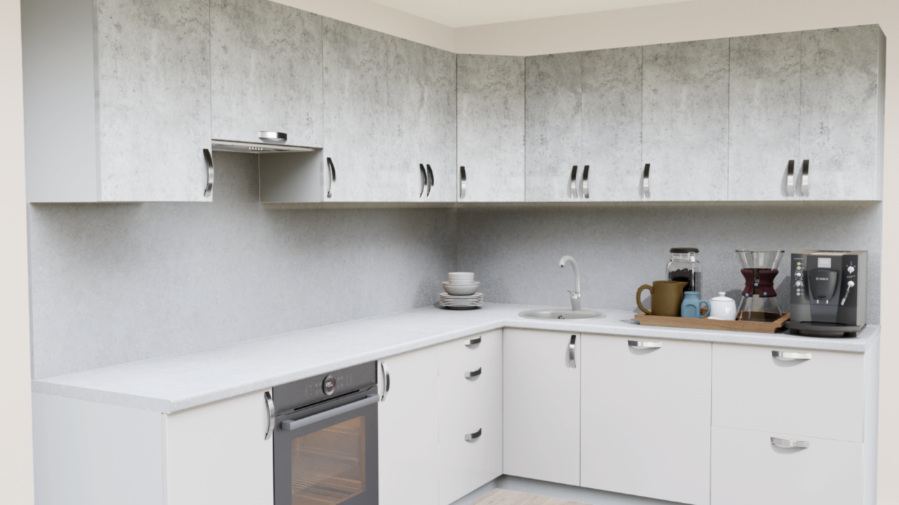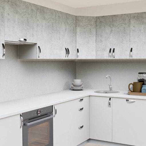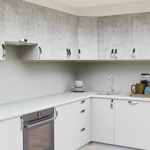 4. Угловая кухня Бетон светлый 1865 со столешницей 4040-S Антарес и со стеновой панелью 4040-S Антарес.