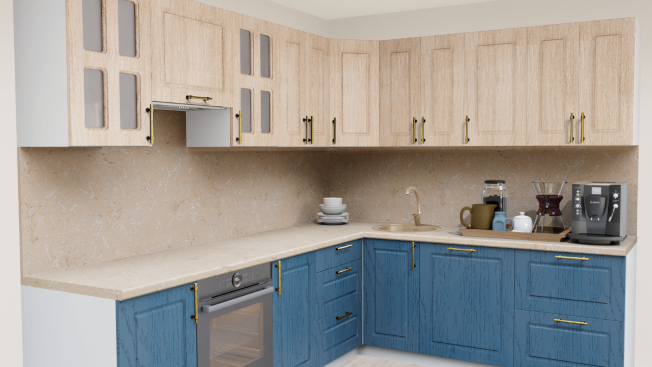 2. Угловая кухня Дуб светлый 5028 Квадро со столешницей 2231-S Оникс классический бежевый и со стеновой панелью 2231-S Оникс классический бежевый.