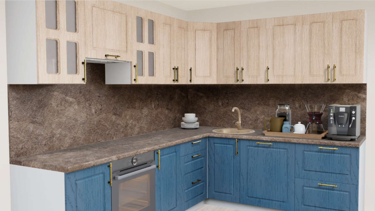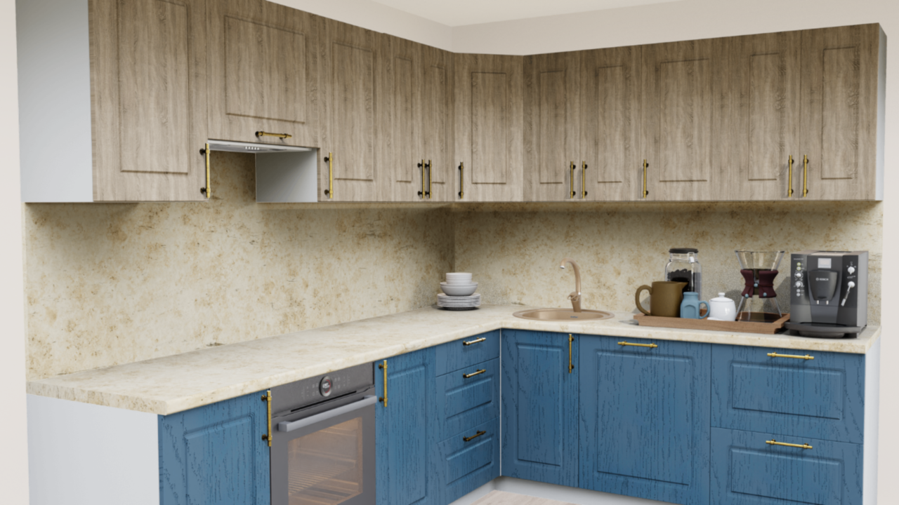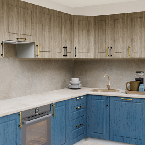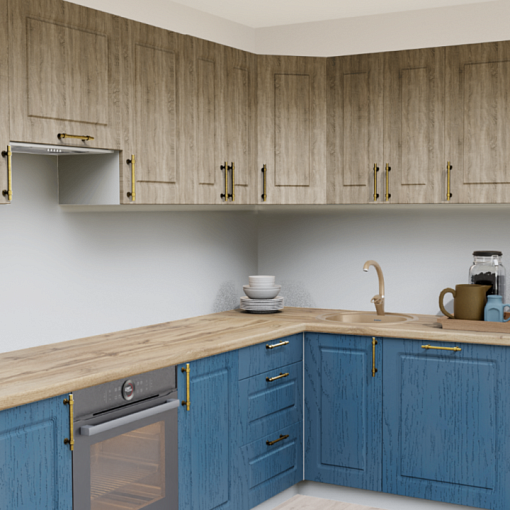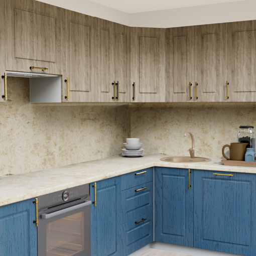 Сочетание синего цвета и текстуры натурального дерева на кухне, дополненного оригинальными ручками- релингами вместе с теплыми оттенками столешницы для создания по-настоящему домашней атмосферы.