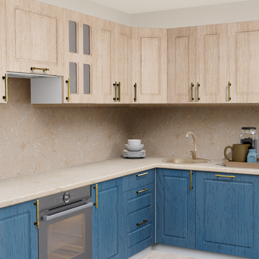 5. Угловая кухня Дуб светлый 5028 Квадро со столешницей 2013-SO Юрский камень и со стеновой панелью 2013-SO Юрский камень.