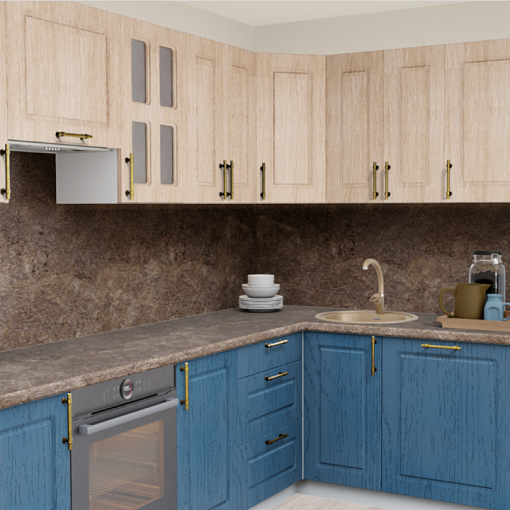 3. Угловая кухня Дуб светлый 5028 Квадро со столешницей 910-Br Обсидиан коричневый и со стеновой панелью 910-Br Обсидиан коричневый.
