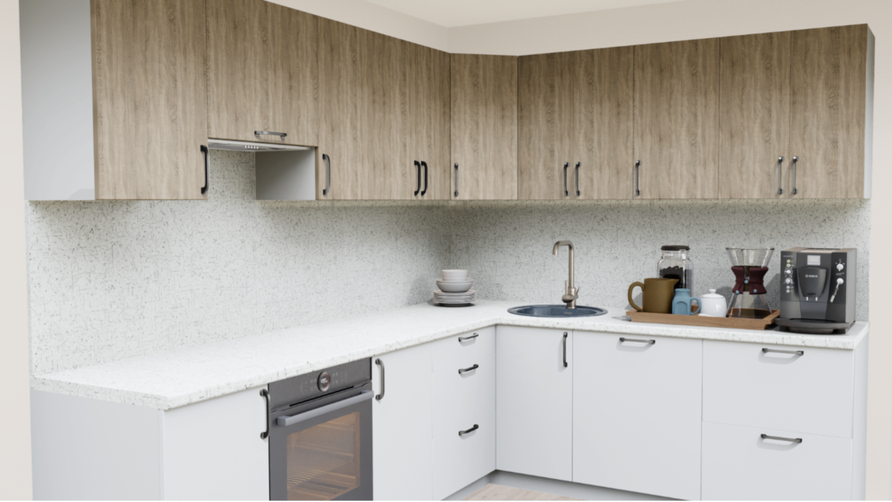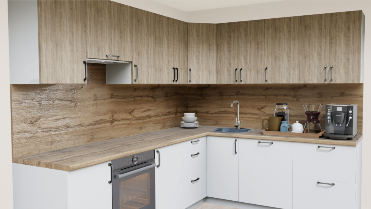 2. Угловая кухня Дуб Тоскана светлый 1549 со столешницей 7052-FL Дуб Вотан и со стеновой панелью 7052-FL Дуб Вотан.