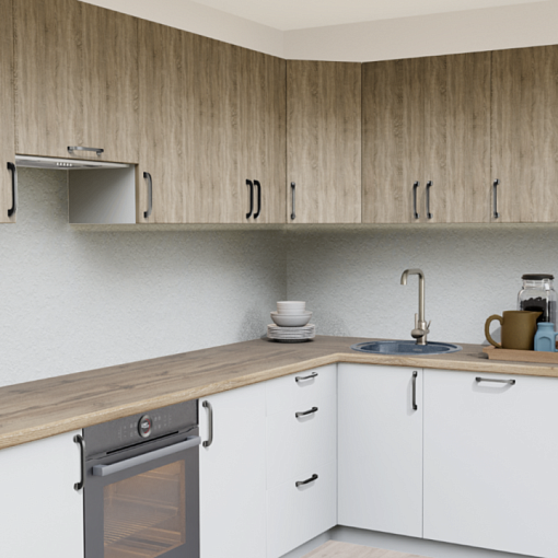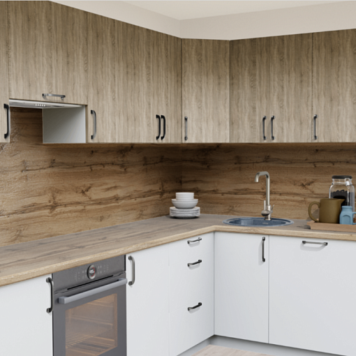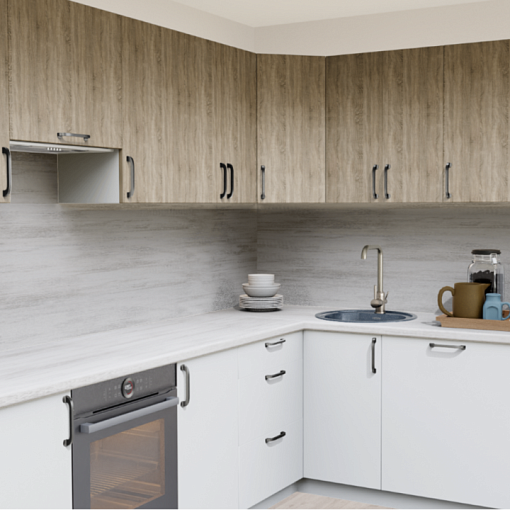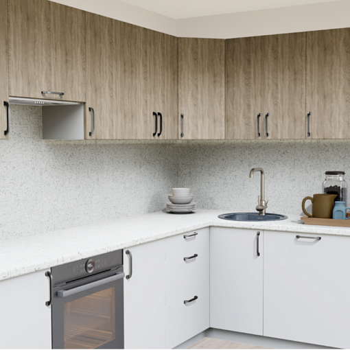 Cовременная кухня с фасадами МДФ с ПВХ в актуальном сочетании текстуры дуба и белого цвета. Скандинавский стиль, который будет уместно смотреться в помещении любого размера.