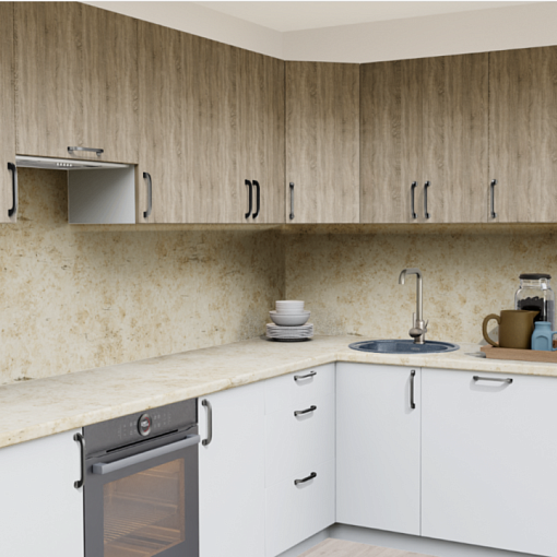 4. Угловая кухня Дуб Тоскана светлый 1549 со столешницей 7046-S Daily и со стеновой панелью 7046-S Daily.