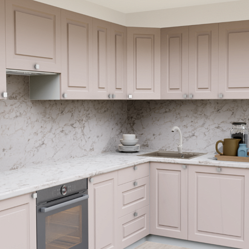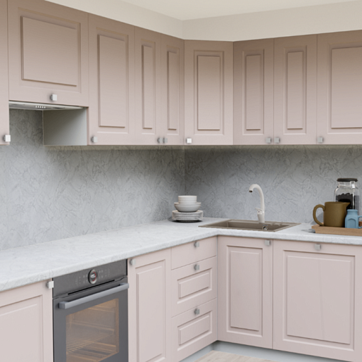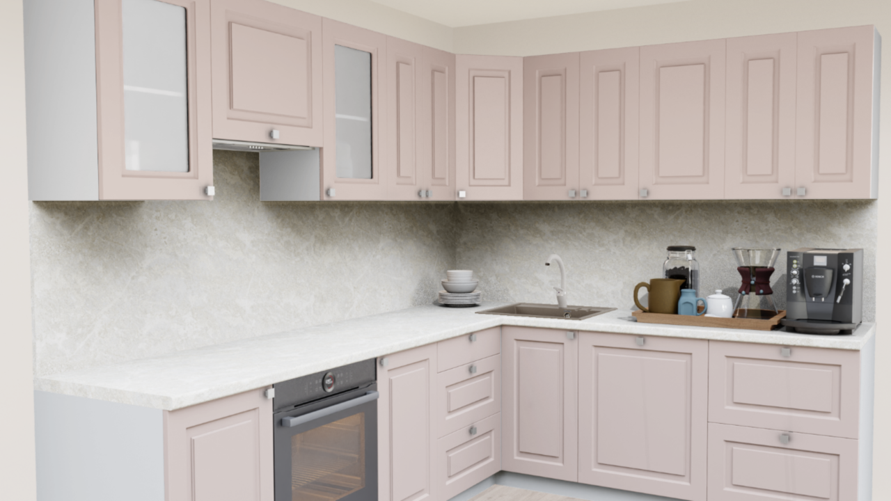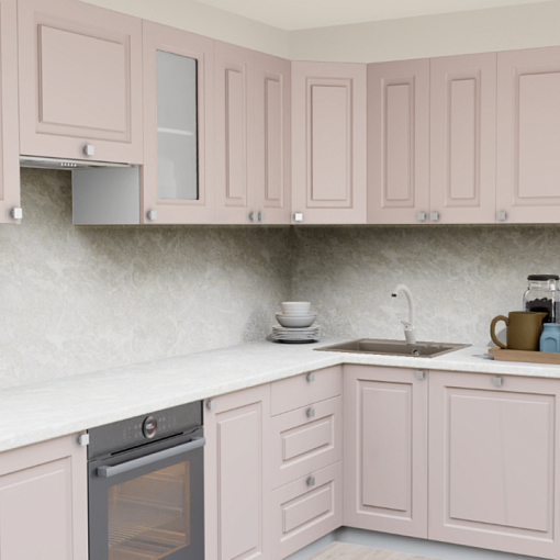 3. Угловая кухня Латте 854 Прямоугольник со столешницей 7024-Е Мрамор Империал и со стеновой панелью 7024-Е Мрамор Империал.