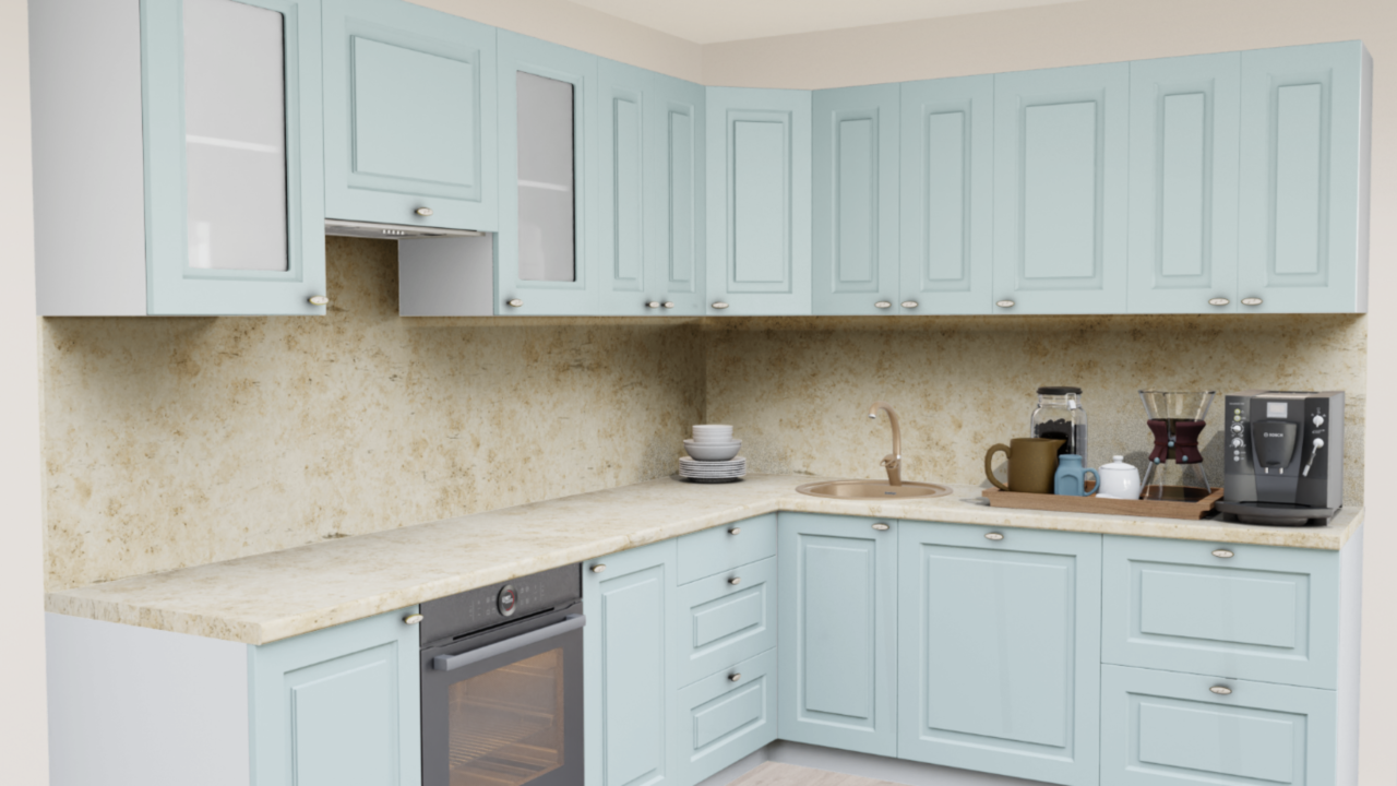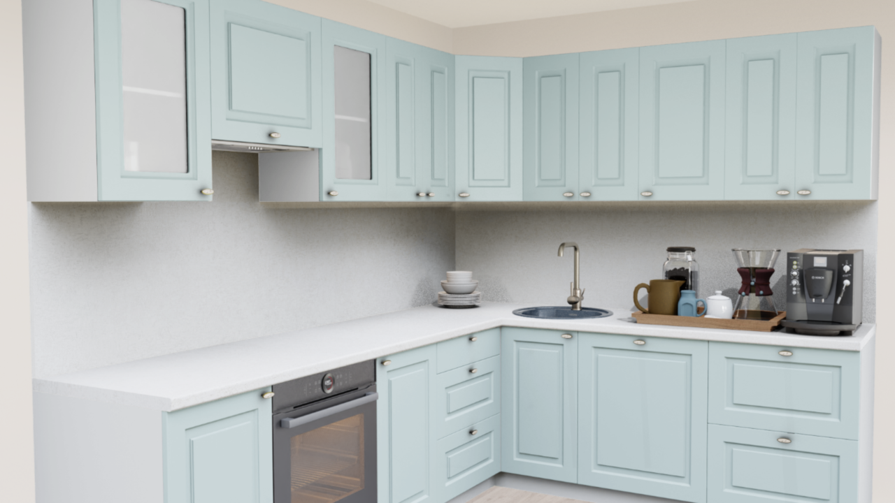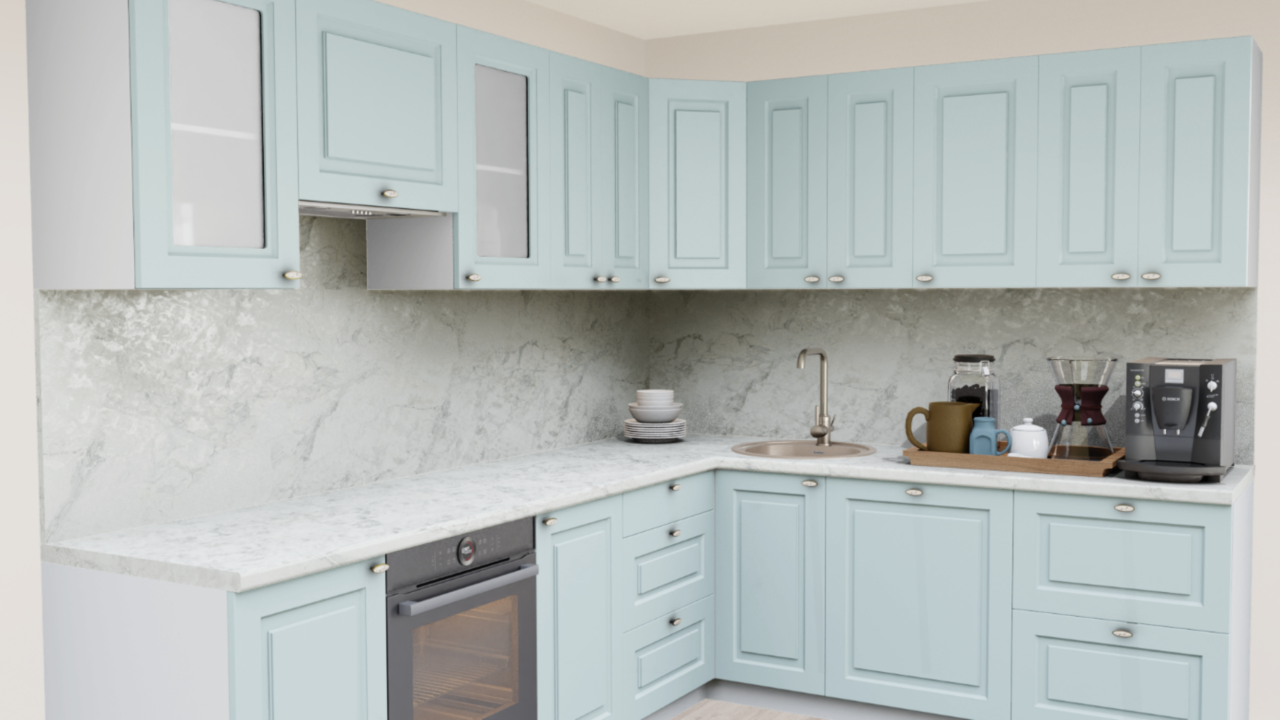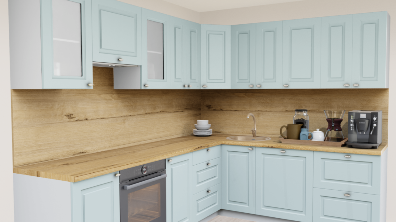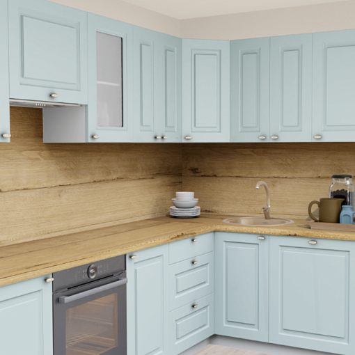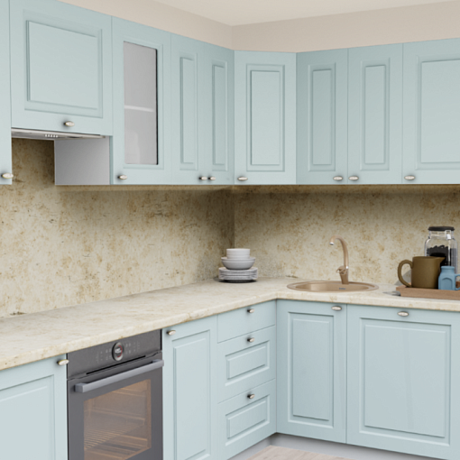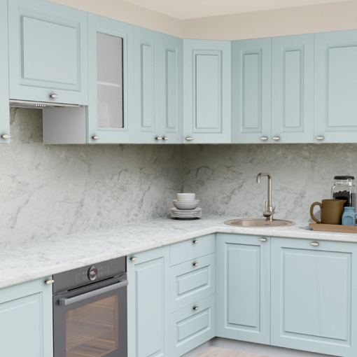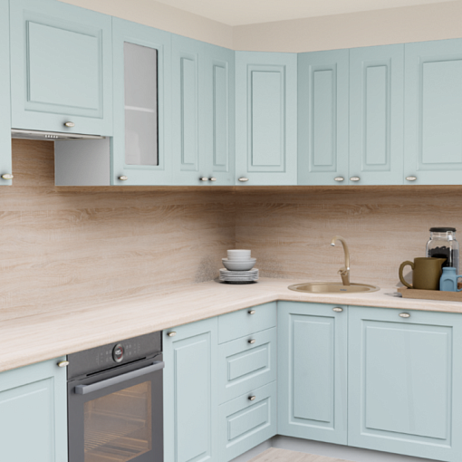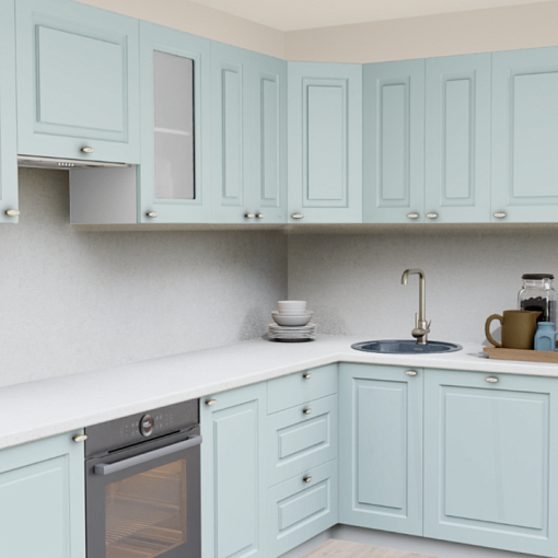 Изящество и прохлада этого решения кроется в сочетании классической строгой фрезеровки и матовой поверхности сложного голубого оттенка фасада. Идеальный вариант для кухни в сочетании со светлой столешницей и классическими ручками с керамикой, позволяющей обыграть практически любой интерьер.