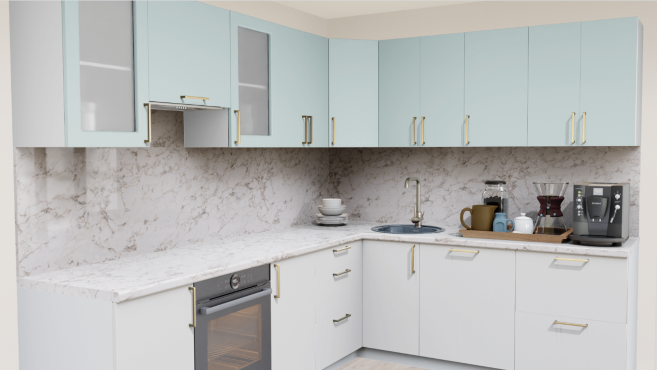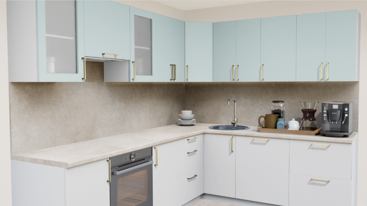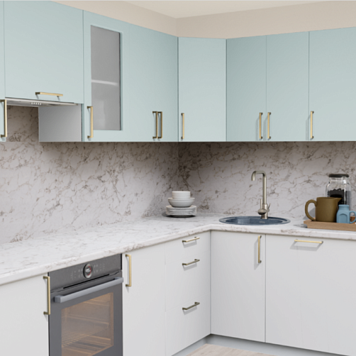 Кухонный гарнитур с фасадами МДФ в пленке ПВХ в актуальных пастельных оттенках со столешницей под...подробнее