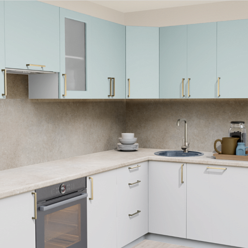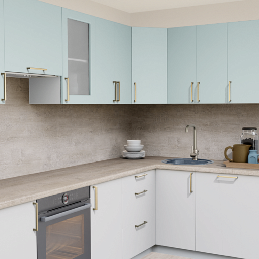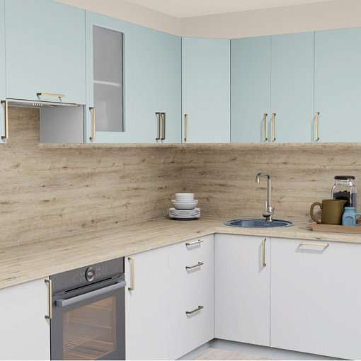 Кухонный гарнитур с фасадами МДФ в пленке ПВХ в актуальных пастельных оттенках со столешницей под дерево сделает любую кухню уютной и светлой. Матовая поверхность в сочетании с удобными ручками делает это решение очень практичным в эксплуатации.