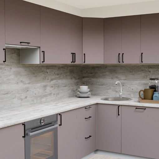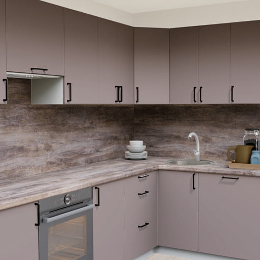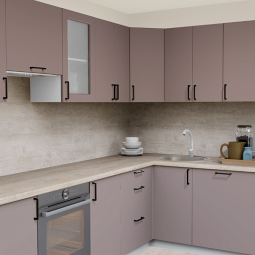 Пастельные оттенки в сочетании с матовой текстурой - тренд последних лет в проектировании интерьера кухни. Эргономичные темные ручки и теплые оттенки столешницы для дополненного образа.
