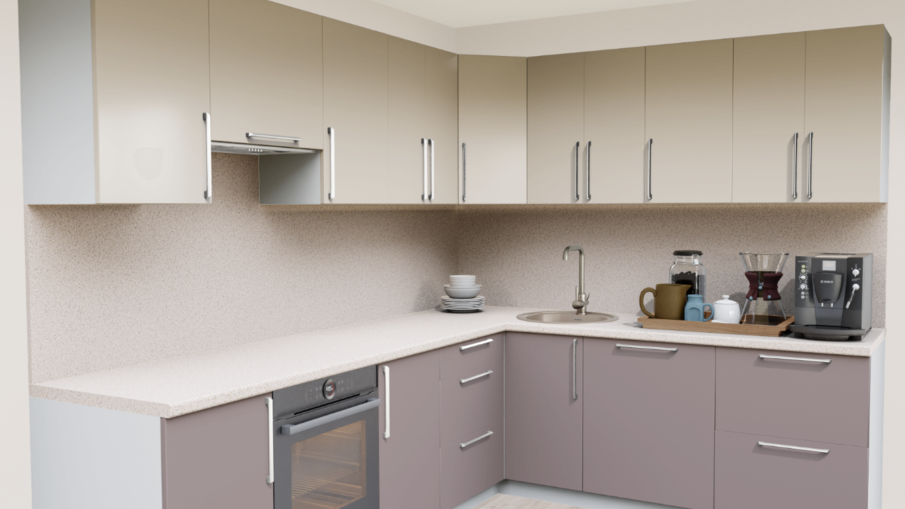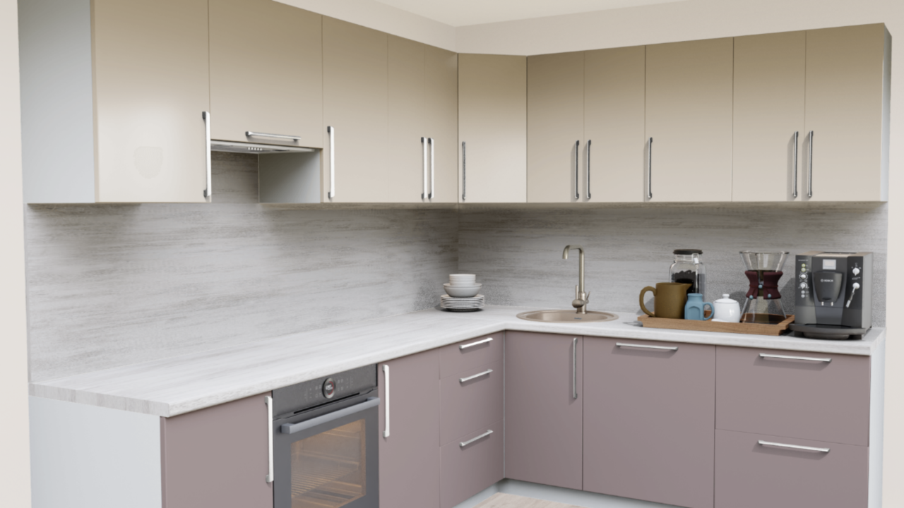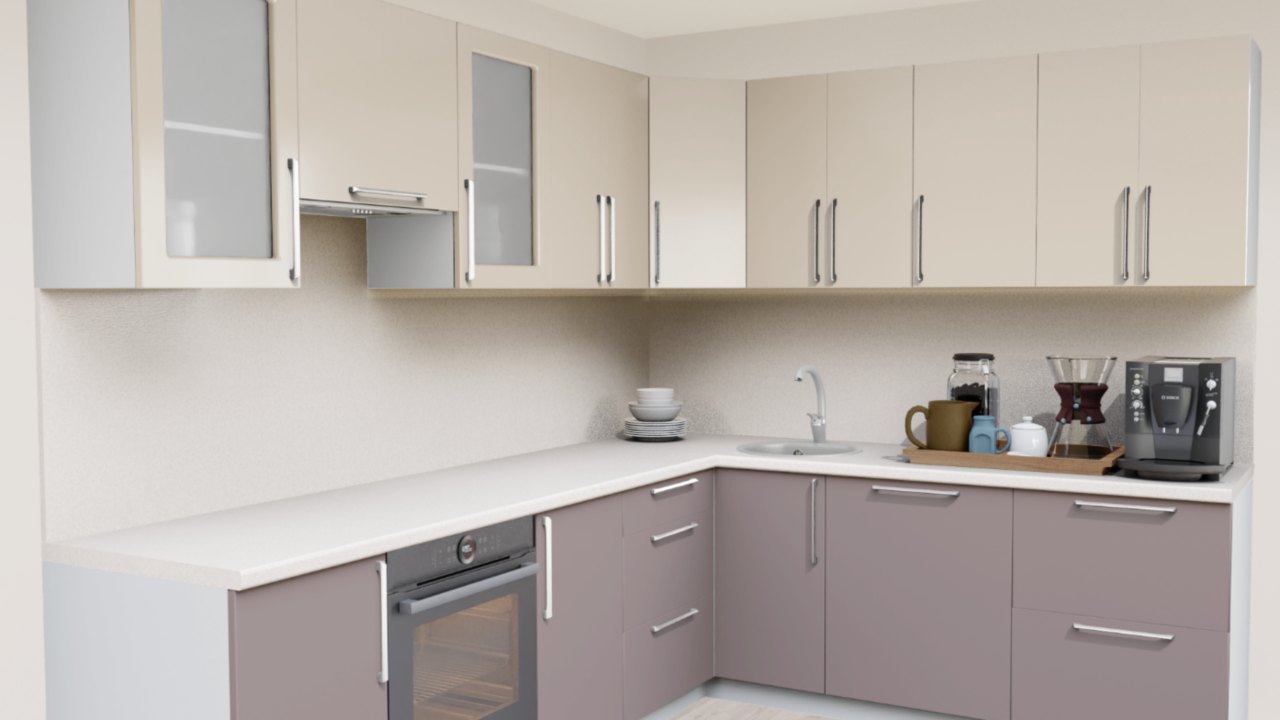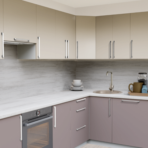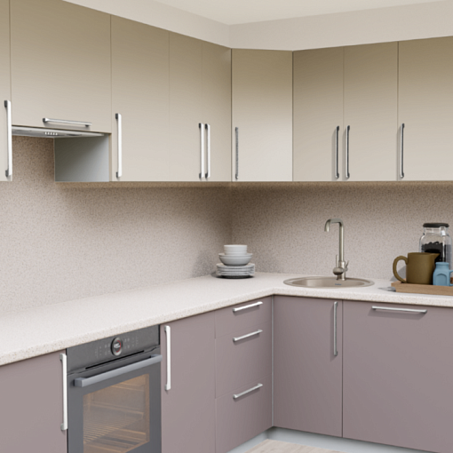 2. Угловая кухня Пастель Латте 1220 со столешницей 7046-S Daily и со стеновой панелью 7046-S Daily.