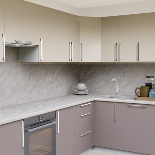 1. Угловая кухня Пастель Латте 1220 со столешницей 9585-S Мрамор бежевый светлый и со стеновой панелью 9585-S Мрамор бежевый светлый.