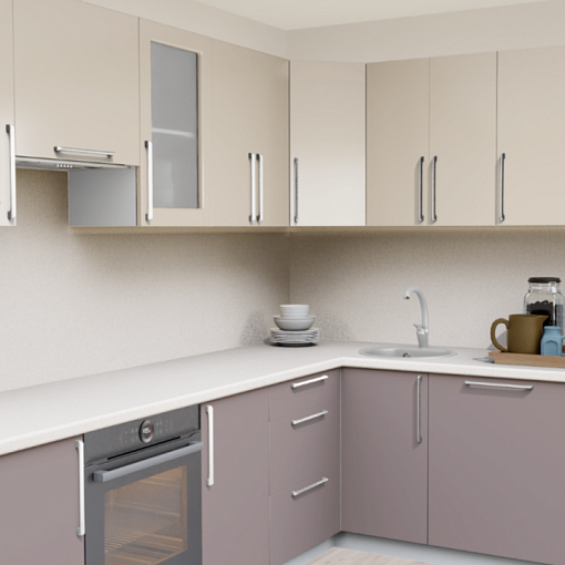 4. Угловая кухня Пастель Латте 1220 со столешницей 2236-S Семолина бежевая и со стеновой панелью 2236-S Семолина бежевая.